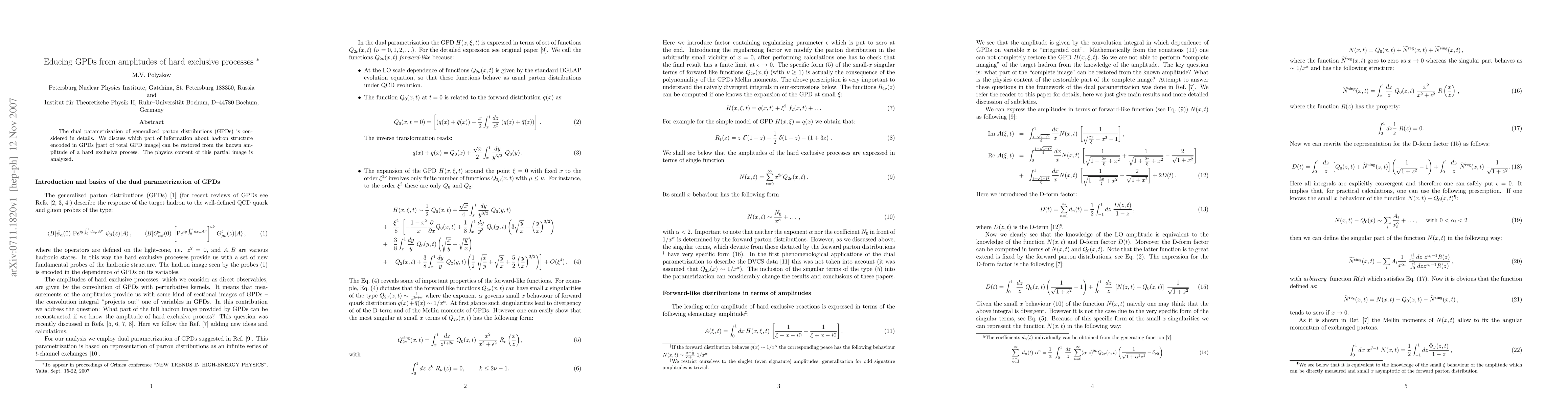 The dual parametrization of generalized parton distributions (GPDs) is considered in details. We discuss which part of information about hadron structure encoded in GPDs [part of total GPD image] can be restored from the known amplitude of a hard exclusive process. The physics content of this partial image is analyzed.