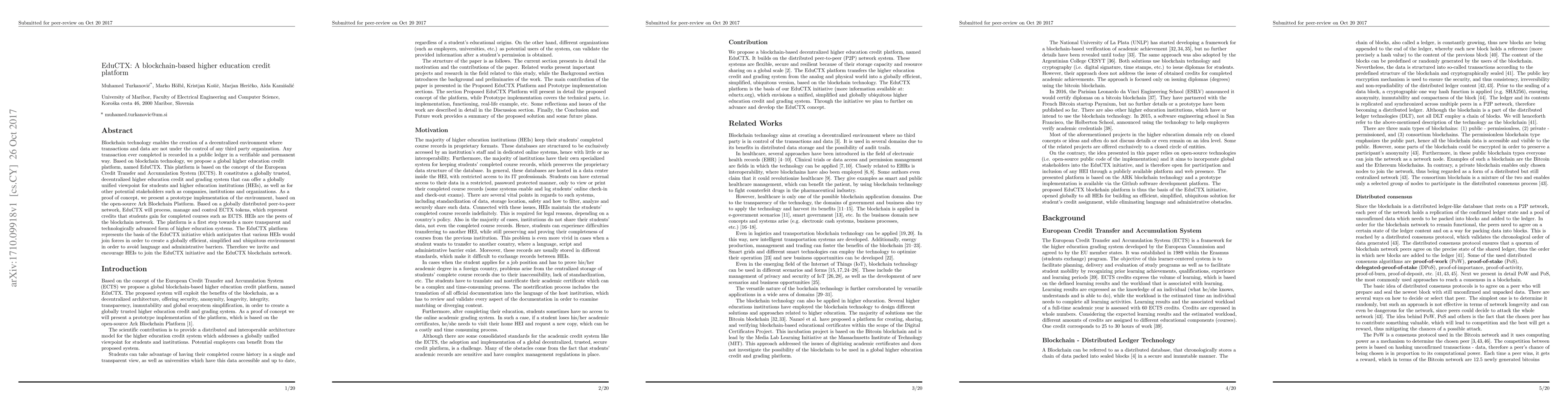 EduCTX proposes a blockchain-based platform for a decentralized, globally trusted higher education credit system inspired by the European Credit Transfer and Accumulation System (ECTS). The platform aims to create a transparent, unified, and efficient environment for students, institutions, and other stakeholders.