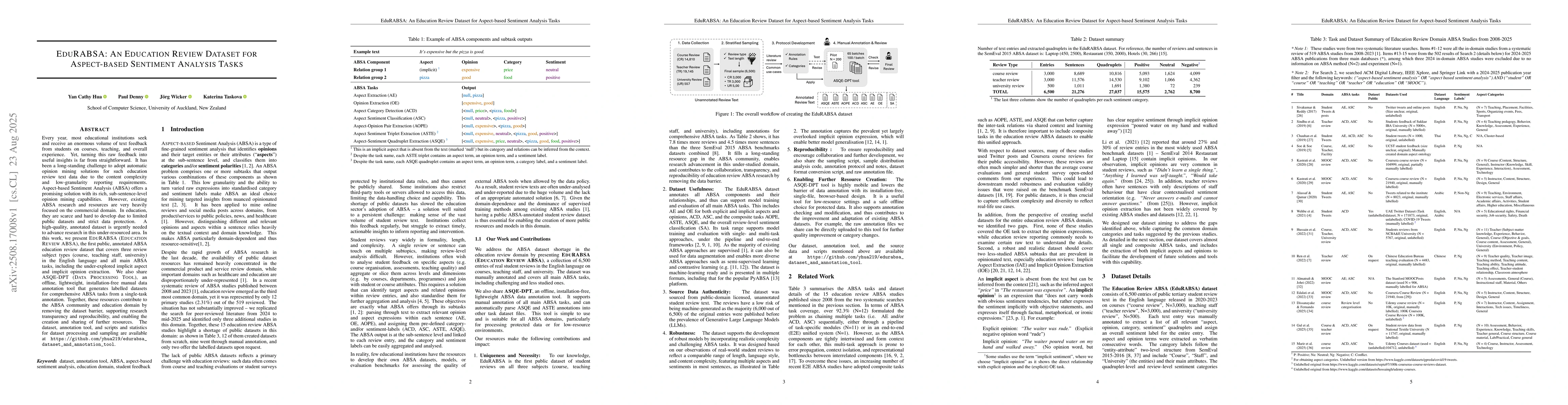 Every year, most educational institutions seek and receive an enormous volume of text feedback from students on courses, teaching, and overall experience. Yet, turning this raw feedback into useful insights is far from straightforward. It has been a long-standing challenge to adopt automatic opinion mining solutions for such education review text data due to the content complexity and low-granularity reporting requirements. Aspect-based Sentiment Analysis (ABSA) offers a promising solution with its rich, sub-sentence-level opinion mining capabilities. However, existing ABSA research and resources are very heavily focused on the commercial domain. In education, they are scarce and hard to develop due to limited public datasets and strict data protection. A high-quality, annotated dataset is urgently needed to advance research in this under-resourced area. In this work, we present EduRABSA (Education Review ABSA), the first public, annotated ABSA education review dataset that covers three review subject types (course, teaching staff, university) in the English language and all main ABSA tasks, including the under-explored implicit aspect and implicit opinion extraction. We also share ASQE-DPT (Data Processing Tool), an offline, lightweight, installation-free manual data annotation tool that generates labelled datasets for comprehensive ABSA tasks from a single-task annotation. Together, these resources contribute to the ABSA community and education domain by removing the dataset barrier, supporting research transparency and reproducibility, and enabling the creation and sharing of further resources. The dataset, annotation tool, and scripts and statistics for dataset processing and sampling are available at https://github.com/yhua219/edurabsa_dataset_and_annotation_tool.