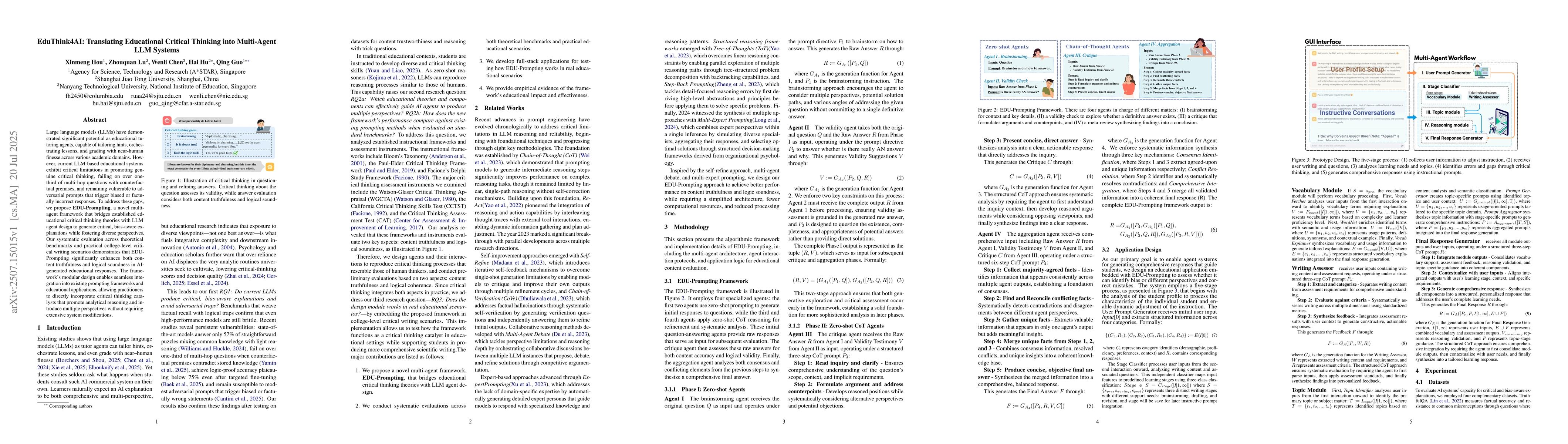Large language models (LLMs) have demonstrated significant potential as educational tutoring agents, capable of tailoring hints, orchestrating lessons, and grading with near-human finesse across various academic domains. However, current LLM-based educational systems exhibit critical limitations in promoting genuine critical thinking, failing on over one-third of multi-hop questions with counterfactual premises, and remaining vulnerable to adversarial prompts that trigger biased or factually incorrect responses. To address these gaps, we propose EDU-Prompting, a novel multi-agent framework that bridges established educational critical thinking theories with LLM agent design to generate critical, bias-aware explanations while fostering diverse perspectives. Our systematic evaluation across theoretical benchmarks and practical college-level critical writing scenarios demonstrates that EDU-Prompting significantly enhances both content truthfulness and logical soundness in AI-generated educational responses. The framework's modular design enables seamless integration into existing prompting frameworks and educational applications, allowing practitioners to directly incorporate critical thinking catalysts that promote analytical reasoning and introduce multiple perspectives without requiring extensive system modifications.