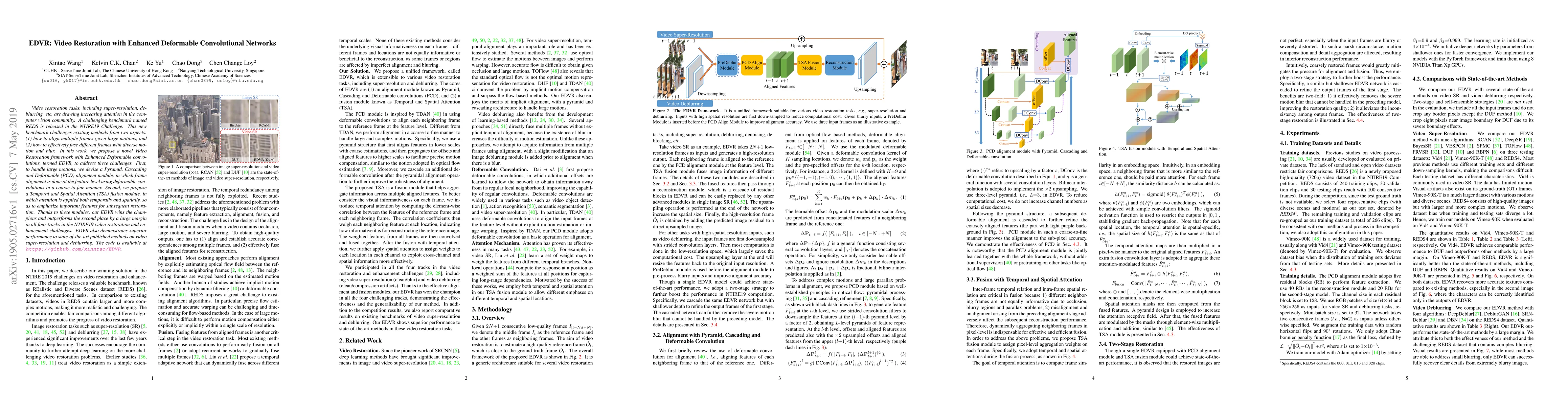 EDVR introduces a novel framework with Enhanced Deformable Convolutional Networks to tackle video restoration challenges, including super-resolution and deblurring, by employing a Pyramid, Cascading and Deformable (PCD) alignment module and a Temporal and Spatial Attention (TSA) fusion module, achieving top performance in NTIRE19 video restoration challenges.