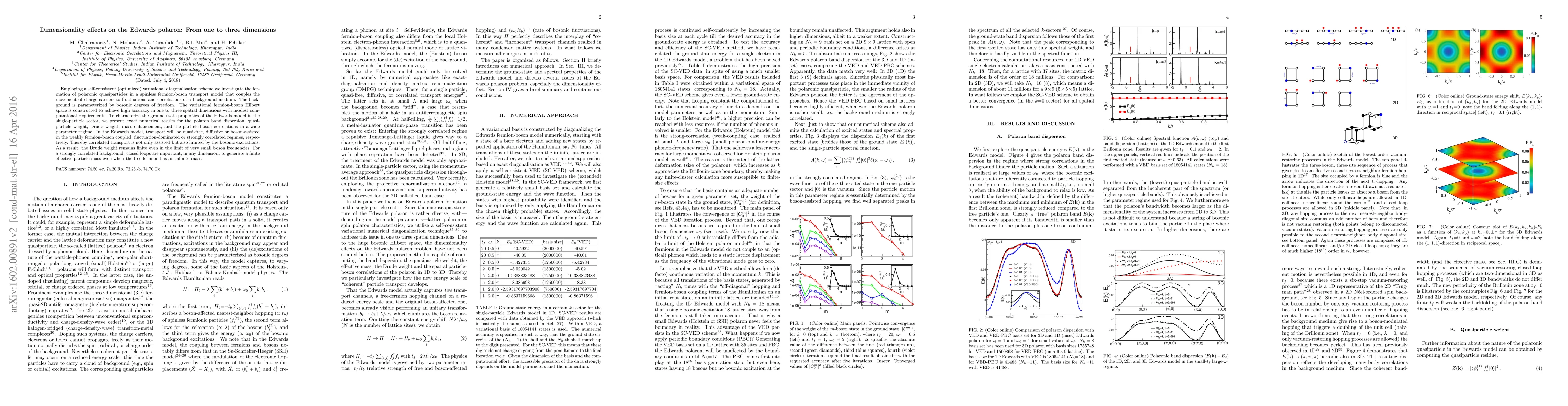 Employing a self-consistent (optimized) variational diagonalization scheme, we investigate the formation of polaronic quasiparticles in a spinless fermion-boson transport model that couples the movement of charge carriers to fluctuations and correlations of a background medium. The background is parameterized by bosonic degrees of freedom. The variational fermion-boson Hilbert space is constructed to achieve high accuracy in one to three spatial dimensions with modest computational requirements. To characterize the ground-state properties of the Edwards model in the single-particle sector, we present exact numerical results for the polaron band dispersion, quasiparticle weight, Drude weight, mass enhancement, and the particle-boson correlations in a wide parameter regime. In the Edwards model, transport will be quasifree, diffusive or boson-assisted in the weakly fermion-boson coupled, fluctuation-dominated or strongly correlated regimes, respectively. Thereby correlated transport is not only assisted but also limited by the bosonic excitations. As a result, the Drude weight remains finite even in the limit of very small boson frequencies. For a strongly correlated background, closed loops are important, in any dimension, to generate a finite effective particle mass even when the free fermion has an infinite mass.