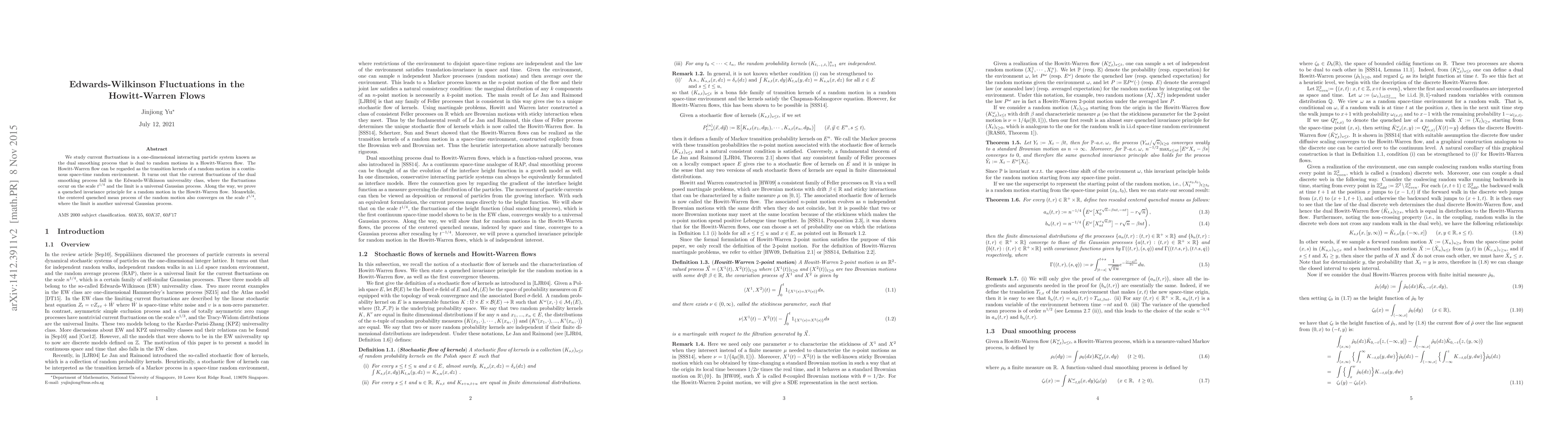 We study current fluctuations in a one-dimensional interacting particle system known as the dual smoothing process that is dual to random motions in a Howitt-Warren flow. The Howitt-Warren flow can be regarded as the transition kernels of a random motion in a continuous space-time random environment. It turns out that the current fluctuations of the dual smoothing process fall in the Edwards-Wilkinson universality class, where the fluctuations occur on the scale $t^{1/4}$ and the limit is a universal Gaussian process. Along the way, we prove a quenched invariance principle for a random motion in the Howitt-Warren flow. Meanwhile, the centered quenched mean process of the random motion also converges on the scale $t^{1/4}$, where the limit is another universal Gaussian process.