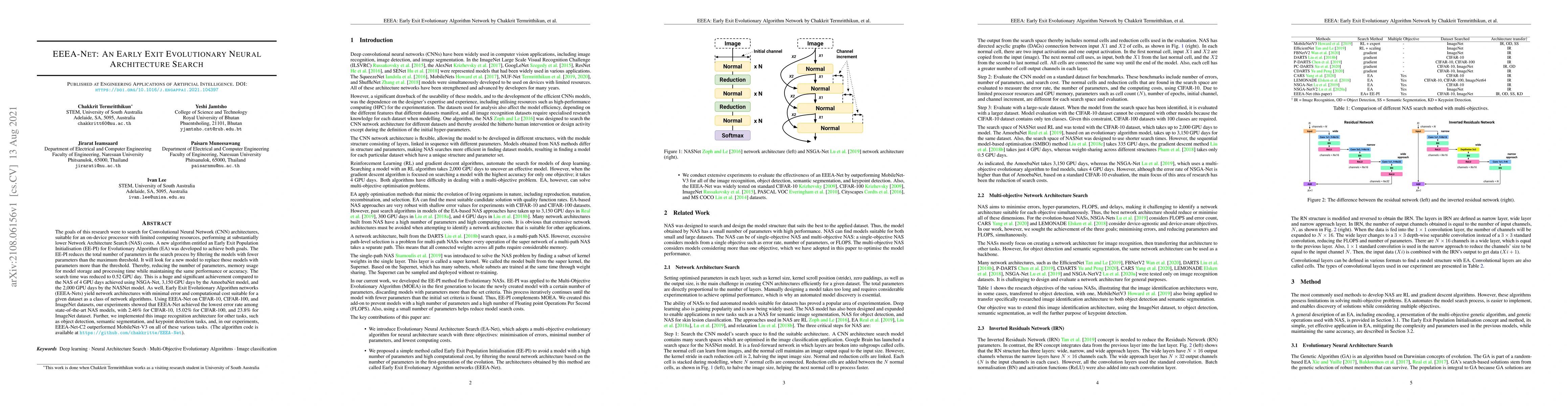 This research introduces EEEA-Net, an Early Exit Evolutionary Neural Architecture Search algorithm that significantly reduces the computational cost of searching for efficient CNN architectures for on-device processors. The EE-PI algorithm cuts search time to 0.52 GPU days, achieving lower error rates on CIFAR-10, CIFAR-100, and ImageNet datasets compared to other NAS models.