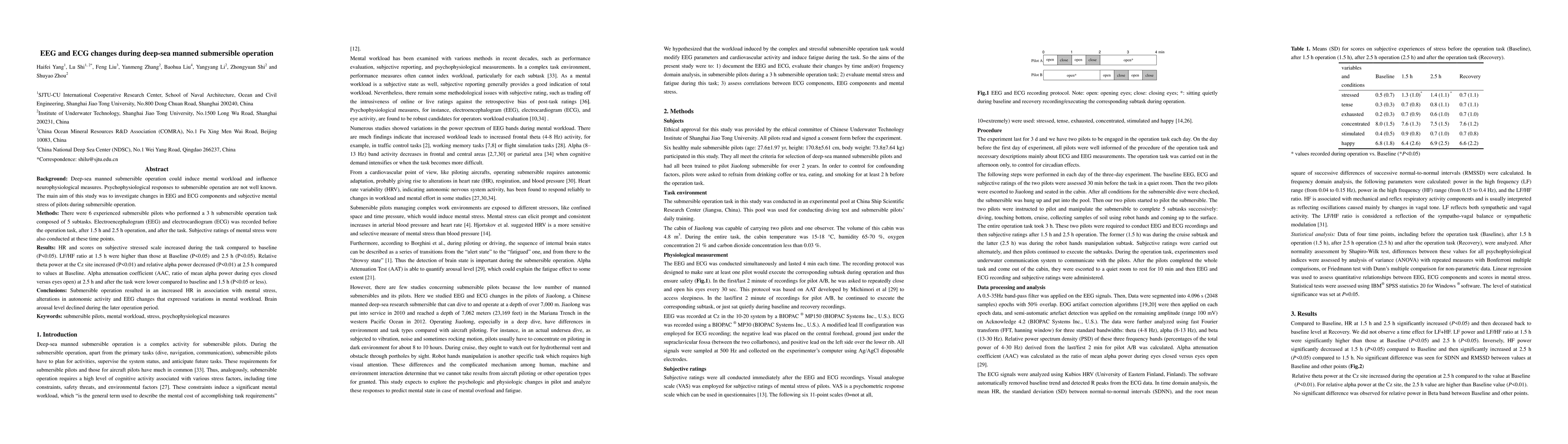 Background: Deep-sea manned submersible operation could induce mental workload and influence neurophysiological measures. Psychophysiological responses to submersible operation are not well known. The main aim of this study was to investigate changes in EEG and ECG components and subjective mental stress of pilots during submersible operation. Methods: There were 6 experienced submersible pilots who performed a 3 h submersible operation task composed of 5 subtasks. Electroencephalogram (EEG) and electrocardiogram (ECG) was recorded before the operation task, after 1.5 h and 2.5 h operation, and after the task. Subjective ratings of mental stress were also conducted at these time points. Results: HR and scores on subjective stressed scale increased during the task compared to baseline (P<0.05). LF/HF ratio at 1.5 h were higher than those at Baseline (P<0.05) and 2.5 h (P<0.05). Relative theta power at the Cz site increased (P<0.01) and relative alpha power decreased (P<0.01) at 2.5 h compared to values at Baseline. Alpha attenuation coefficient (AAC, ratio of mean alpha power during eyes closed versus eyes open) at 2.5 h and after the task were lower compared to baseline and 1.5 h (P<0.05 or less). Conclusions: Submersible operation resulted in an increased HR in association with mental stress, alterations in autonomic activity and EEG changes that expressed variations in mental workload. Brain arousal level declined during the later operation period.