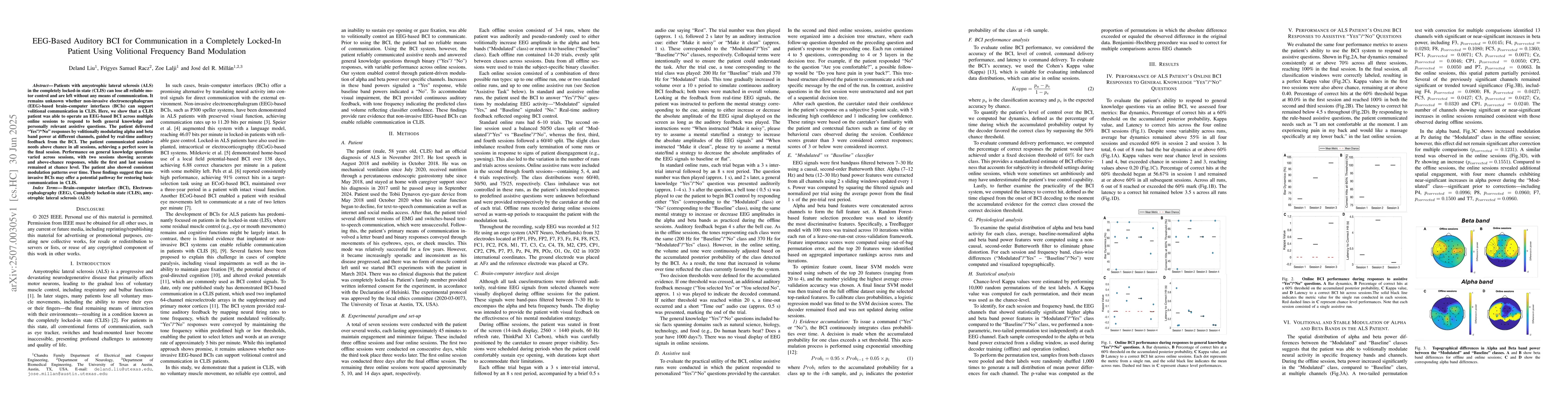 Patients with amyotrophic lateral sclerosis (ALS) in the completely locked-in state (CLIS) can lose all reliable motor control and are left without any means of communication. It remains unknown whether non-invasive electroencephalogram (EEG) based brain-computer interfaces (BCIs) can support volitional communication in CLIS. Here, we show that a CLIS patient was able to operate an EEG-based BCI across multiple online sessions to respond to both general knowledge and personally relevant assistive questions. The patient delivered "Yes"/"No" responses by volitionally modulating alpha and beta band power at different channels, guided by real-time auditory feedback from the BCI. The patient communicated assistive needs above chance in all sessions, achieving a perfect score in the final session. Performance on general knowledge questions varied across sessions, with two sessions showing accurate and above-chance responses, while the first and last sessions remained at chance level. The patient also showed consistent modulation patterns over time. These findings suggest that non-invasive BCIs may offer a potential pathway for restoring basic communication in CLIS.