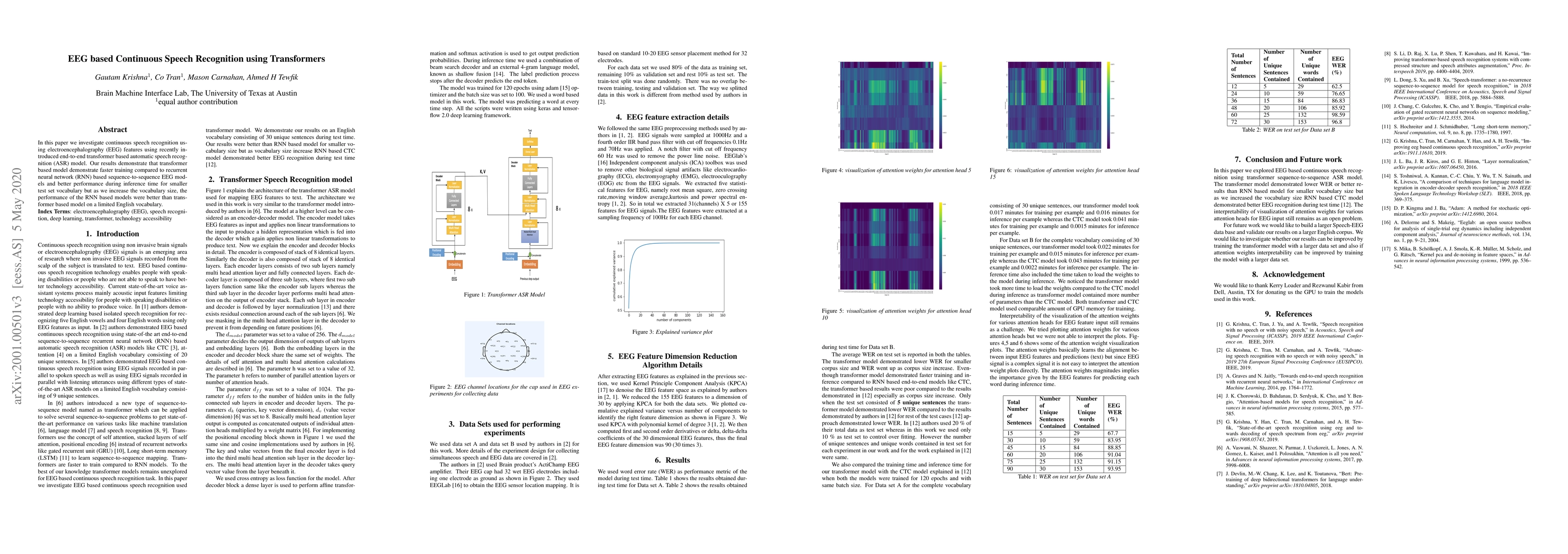 This paper explores continuous speech recognition using EEG features with a transformer-based model, showing faster training and better performance for smaller vocabularies compared to RNN-based models, though RNN models outperform for larger vocabularies.