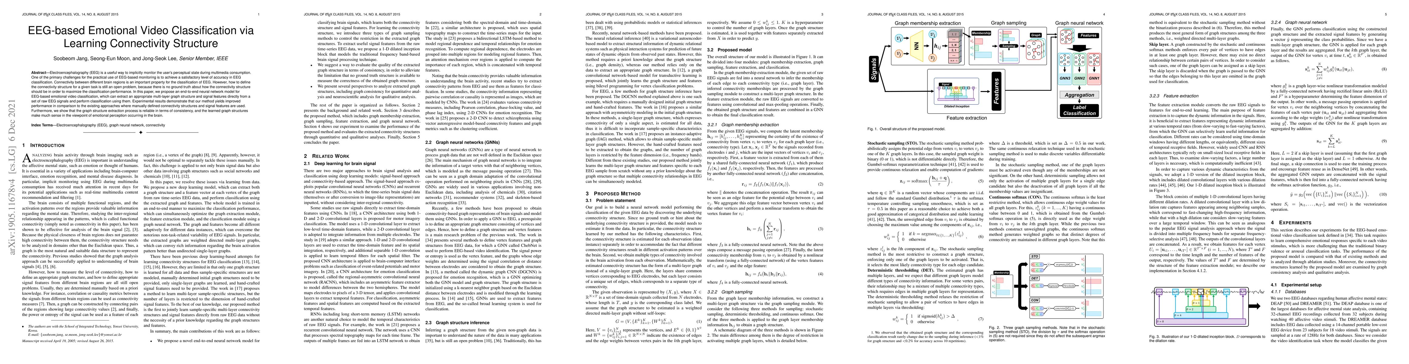 Electroencephalography (EEG) is a useful way to implicitly monitor the users perceptual state during multimedia consumption. One of the primary challenges for the practical use of EEG-based monitoring is to achieve a satisfactory level of accuracy in EEG classification. Connectivity between different brain regions is an important property for the classification of EEG. However, how to define the connectivity structure for a given task is still an open problem, because there is no ground truth about how the connectivity structure should be in order to maximize the classification performance. In this paper, we propose an end-to-end neural network model for EEG-based emotional video classification, which can extract an appropriate multi-layer graph structure and signal features directly from a set of raw EEG signals and perform classification using them. Experimental results demonstrate that our method yields improved performance in comparison to the existing approaches where manually defined connectivity structures and signal features are used. Furthermore, we show that the graph structure extraction process is reliable in terms of consistency, and the learned graph structures make much sense in the viewpoint of emotional perception occurring in the brain.