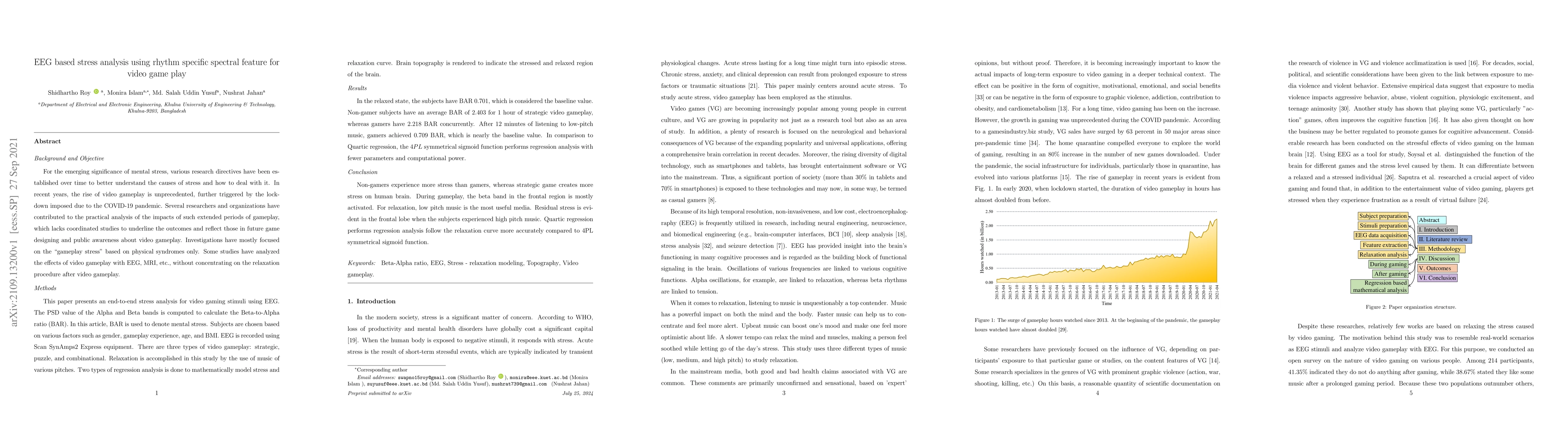 This paper presents an EEG-based stress analysis method for video gameplay, using the Beta-to-Alpha ratio (BAR) derived from Alpha and Beta band power spectral densities to quantify mental stress. Regression analysis models stress and relaxation, showing that non-gamers and gamers exhibit different stress levels during gameplay, which can be reduced by listening to low-pitch music.
