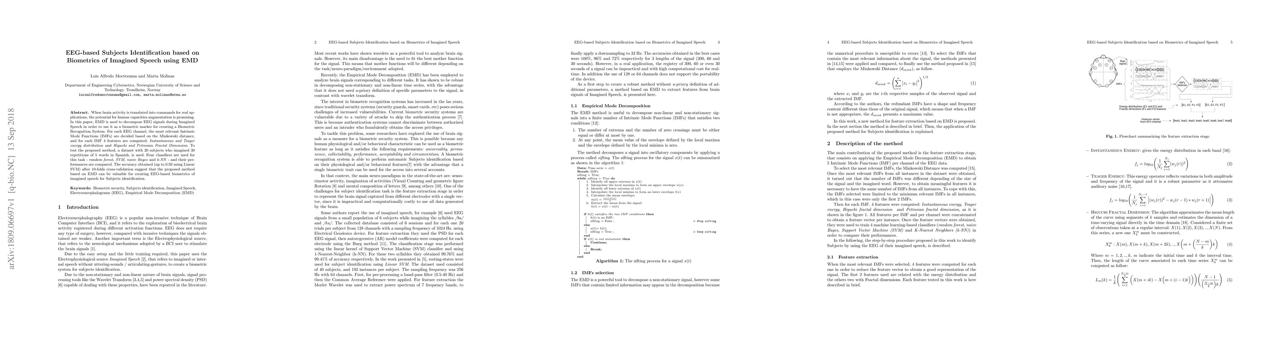 This paper proposes an EEG-based biometric recognition system using EMD to decompose EEG signals during Imagined Speech. It extracts relevant features from the most significant Intrinsic Mode Functions and tests the method with four classifiers, achieving up to 92% accuracy, indicating potential for human capacities augmentation.