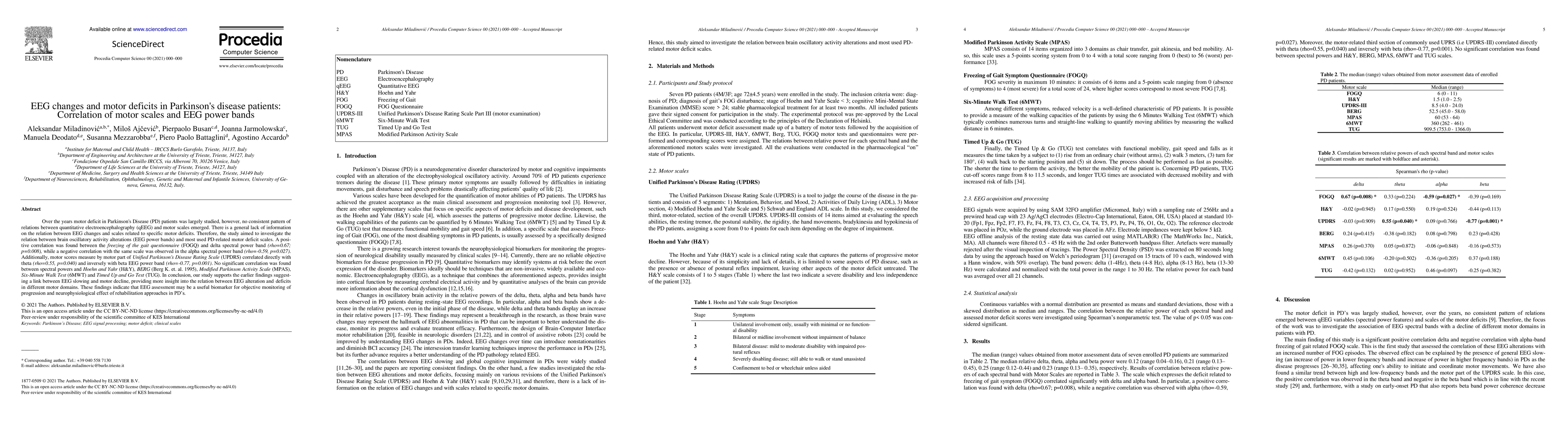 This study investigates the correlation between EEG power bands and specific motor deficit scales in Parkinson's Disease patients, finding significant links between delta and alpha bands with freezing of gait, and theta and beta bands with motor scores from the UPDRS. These results suggest EEG could serve as a biomarker for monitoring disease progression and rehabilitation effects.