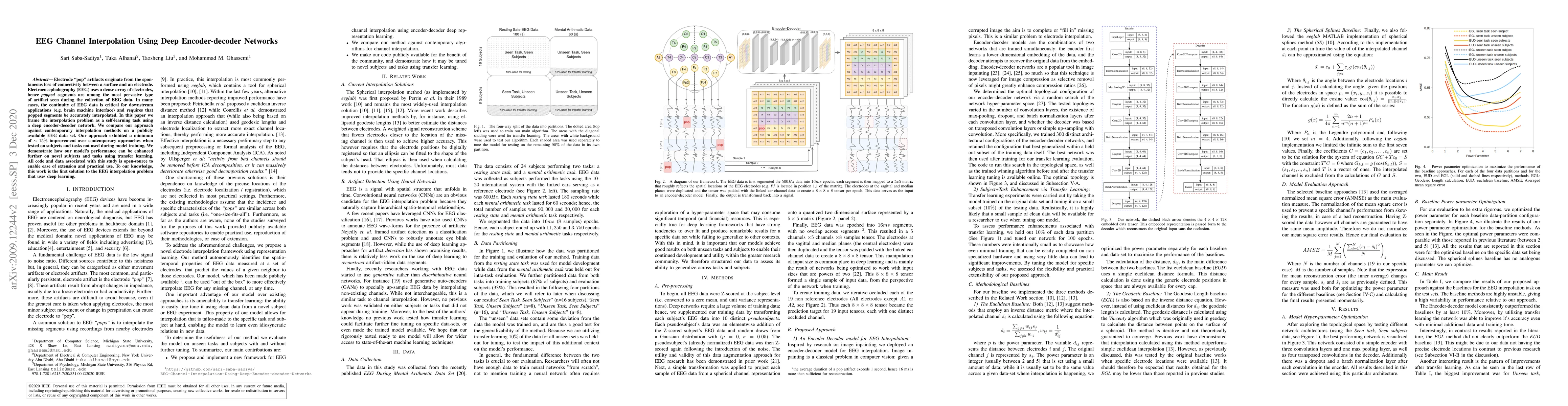 This paper proposes a deep encoder-decoder network for interpolating EEG data affected by electrode "pop" artifacts, achieving at least 15% improvement over existing methods. The authors demonstrate the effectiveness of their approach on unseen subjects and tasks, and make their code and data open-source for further research.