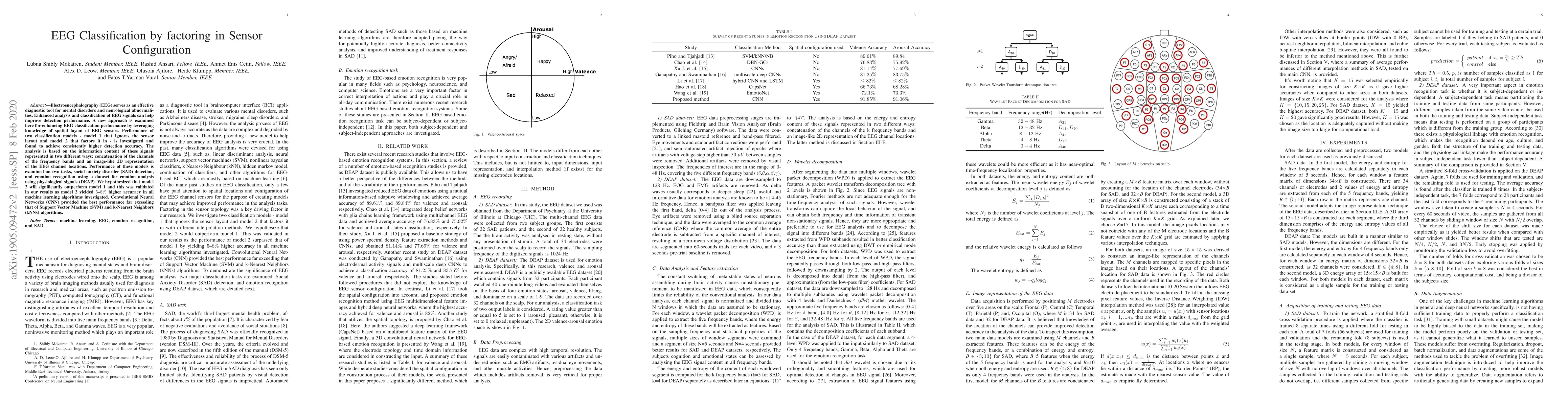 Electroencephalography (EEG) serves as an effective diagnostic tool for mental disorders and neurological abnormalities. Enhanced analysis and classification of EEG signals can help improve detection performance. A new approach is examined here for enhancing EEG classification performance by leveraging knowledge of spatial layout of EEG sensors. Performance of two classification models - model 1 that ignores the sensor layout and model 2 that factors it in - is investigated and found to achieve consistently higher detection accuracy. The analysis is based on the information content of these signals represented in two different ways: concatenation of the channels of the frequency bands and an image-like 2D representation of the EEG channel locations. Performance of these models is examined on two tasks, social anxiety disorder (SAD) detection, and emotion recognition using a dataset for emotion analysis using physiological signals (DEAP). We hypothesized that model 2 will significantly outperform model 1 and this was validated in our results as model 2 yielded $5$--$8\%$ higher accuracy in all machine learning algorithms investigated. Convolutional Neural Networks (CNN) provided the best performance far exceeding that of Support Vector Machine (SVM) and k-Nearest Neighbors (kNNs) algorithms.