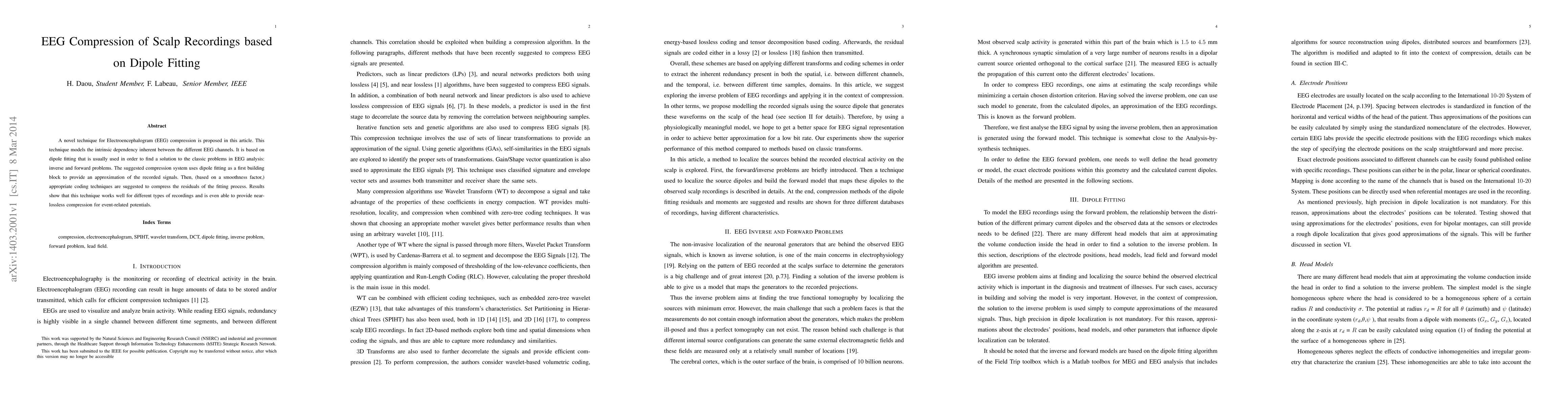 This paper proposes a novel EEG compression technique based on dipole fitting to model dependencies between EEG channels, followed by coding residuals for compression, achieving near-lossless results for event-related potentials. The method effectively addresses the inverse and forward problems in EEG analysis.