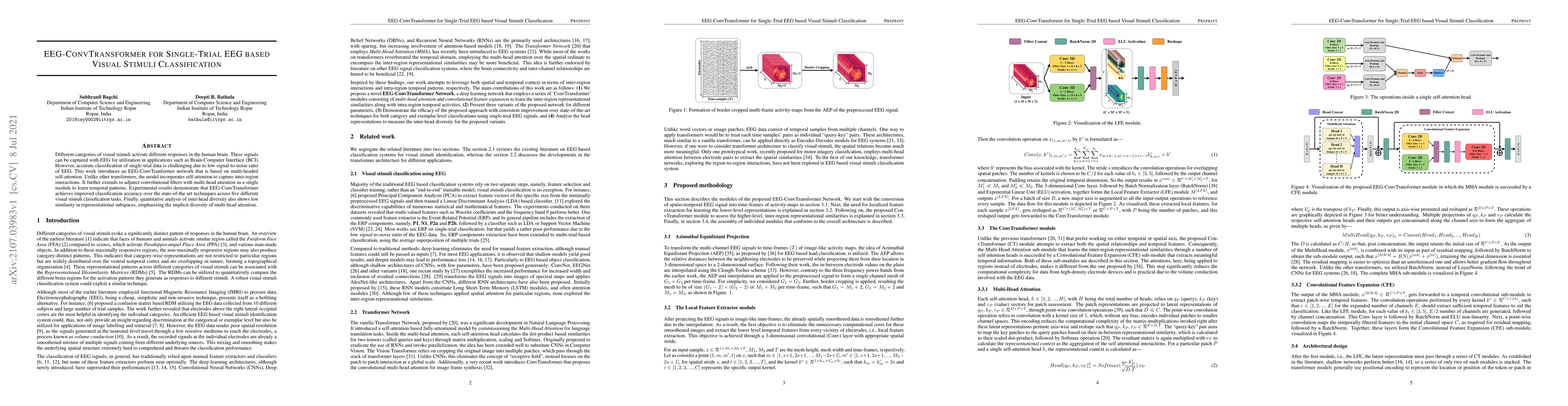 This paper introduces an EEG-ConvTransformer network that combines convolutional filters with multi-headed self-attention to improve single-trial EEG classification for visual stimuli. The model achieves superior accuracy compared to state-of-the-art techniques, demonstrating the effectiveness of capturing inter-region interactions and temporal patterns.