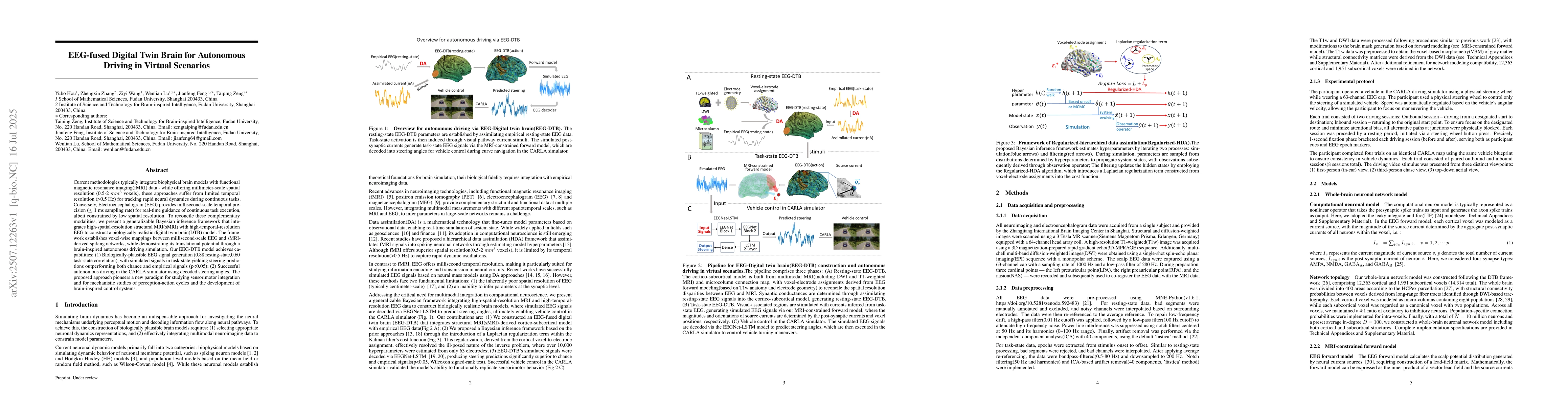 Current methodologies typically integrate biophysical brain models with functional magnetic resonance imaging(fMRI) data - while offering millimeter-scale spatial resolution (0.5-2 mm^3 voxels), these approaches suffer from limited temporal resolution (>0.5 Hz) for tracking rapid neural dynamics during continuous tasks. Conversely, Electroencephalogram (EEG) provides millisecond-scale temporal precision (<=1 ms sampling rate) for real-time guidance of continuous task execution, albeit constrained by low spatial resolution. To reconcile these complementary modalities, we present a generalizable Bayesian inference framework that integrates high-spatial-resolution structural MRI(sMRI) with high-temporal-resolution EEG to construct a biologically realistic digital twin brain(DTB) model. The framework establishes voxel-wise mappings between millisecond-scale EEG and sMRI-derived spiking networks, while demonstrating its translational potential through a brain-inspired autonomous driving simulation. Our EEG-DTB model achieves capabilities: (1) Biologically-plausible EEG signal generation (0.88 resting-state,0.60 task-state correlation), with simulated signals in task-state yielding steering predictions outperforming both chance and empirical signals (p<0.05); (2) Successful autonomous driving in the CARLA simulator using decoded steering angles. The proposed approach pioneers a new paradigm for studying sensorimotor integration and for mechanistic studies of perception-action cycles and the development of brain-inspired control systems.