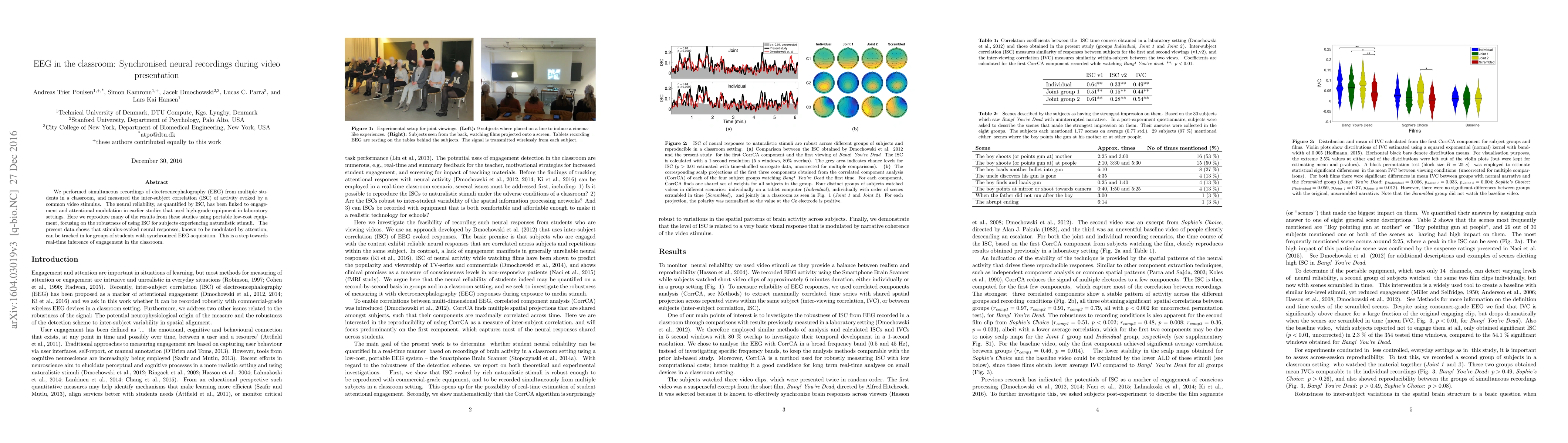 This study uses portable, low-cost EEG equipment to record synchronized neural activity from multiple students during a video presentation, measuring inter-subject correlation (ISC) to assess engagement. The findings demonstrate that ISC can reliably track attention-modulated neural responses in naturalistic classroom settings, paving the way for real-time engagement inference.