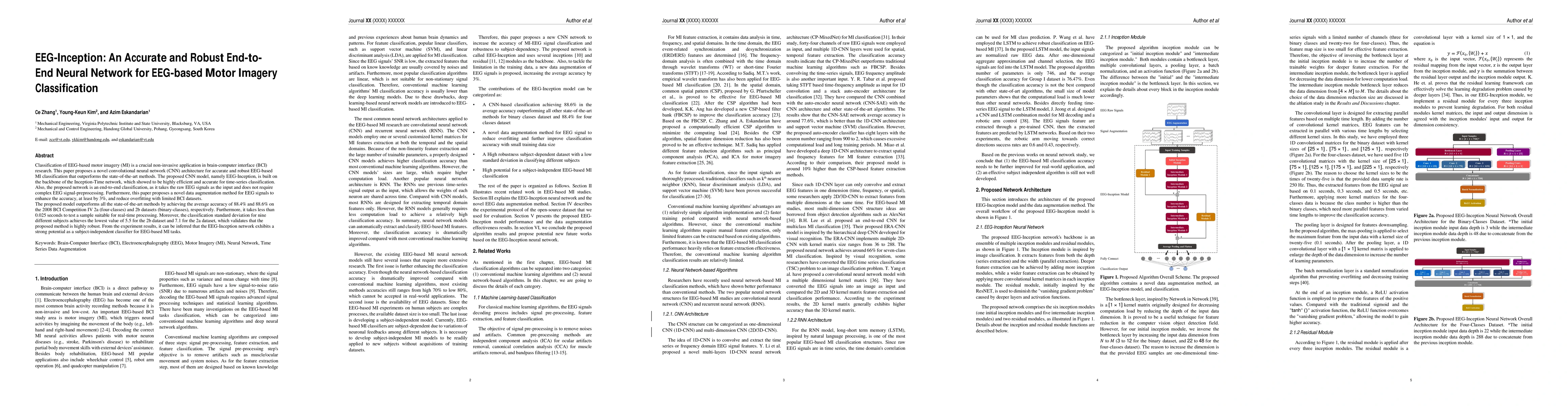 The paper proposes EEG-Inception, a CNN architecture for EEG-based motor imagery classification in brain-computer interfaces, achieving an average accuracy of 88.4% and 88.6% on two datasets, outperforming existing methods. The model is robust and suitable for real-time processing.