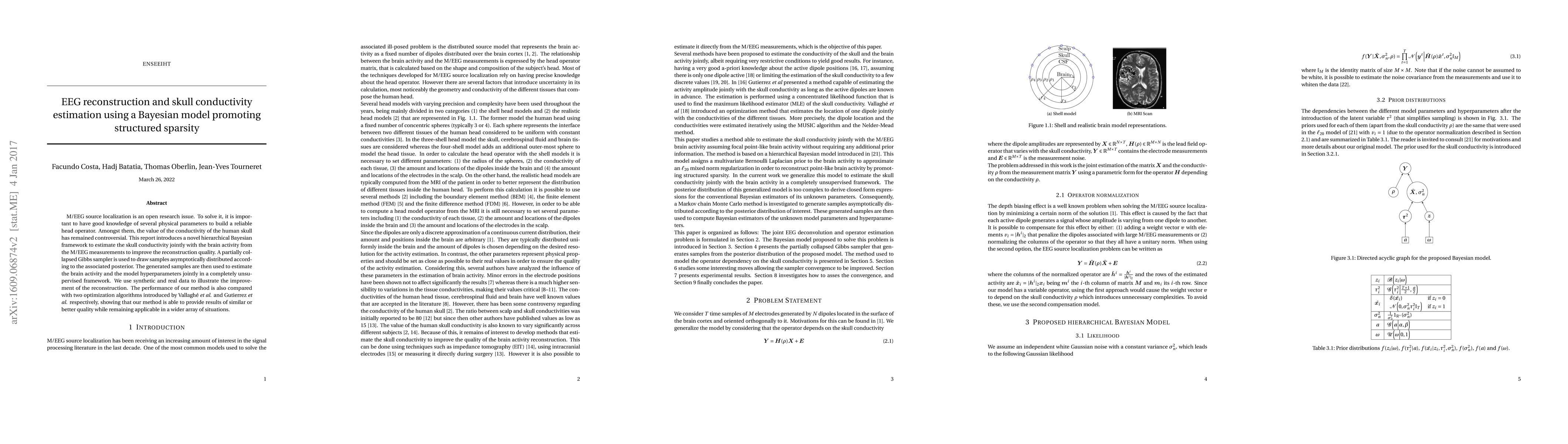 M/EEG source localization is an open research issue. To solve it, it is important to have good knowledge of several physical parameters to build a reliable head operator. Amongst them, the value of the conductivity of the human skull has remained controversial. This report introduces a novel hierarchical Bayesian framework to estimate the skull conductivity jointly with the brain activity from the M/EEG measurements to improve the reconstruction quality. A partially collapsed Gibbs sampler is used to draw samples asymptotically distributed according to the associated posterior. The generated samples are then used to estimate the brain activity and the model hyperparameters jointly in a completely unsupervised framework. We use synthetic and real data to illustrate the improvement of the reconstruction. The performance of our method is also compared with two optimization algorithms introduced by Vallagh\'e \textit{et al.} and Gutierrez \textit{et al.} respectively, showing that our method is able to provide results of similar or better quality while remaining applicable in a wider array of situations.
