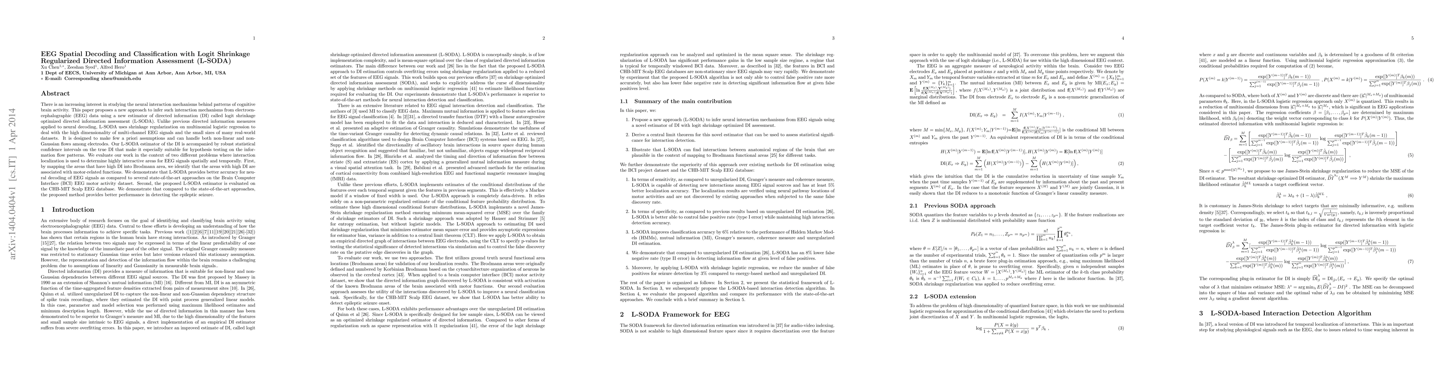 There is an increasing interest in studying the neural interaction mechanisms behind patterns of cognitive brain activity. This paper proposes a new approach to infer such interaction mechanisms from electroencephalographic (EEG) data using a new estimator of directed information (DI) called logit shrinkage optimized directed information assessment (L-SODA). Unlike previous directed information measures applied to neural decoding, L-SODA uses shrinkage regularization on multinomial logistic regression to deal with the high dimensionality of multi-channel EEG signals and the small sizes of many real-world datasets. It is designed to make few a priori assumptions and can handle both non-linear and non-Gaussian flows among electrodes. Our L-SODA estimator of the DI is accompanied by robust statistical confidence intervals on the true DI that make it especially suitable for hypothesis testing on the information flow patterns. We evaluate our work in the context of two different problems where interaction localization is used to determine highly interactive areas for EEG signals spatially and temporally. First, by mapping the areas that have high DI into Brodmann area, we identify that the areas with high DI are associated with motor-related functions. We demonstrate that L-SODA provides better accuracy for neural decoding of EEG signals as compared to several state-of-the-art approaches on the Brain Computer Interface (BCI) EEG motor activity dataset. Second, the proposed L-SODA estimator is evaluated on the CHB-MIT Scalp EEG database. We demonstrate that compared to the state-of-the-art approaches, the proposed method provides better performance in detecting the epileptic seizure.