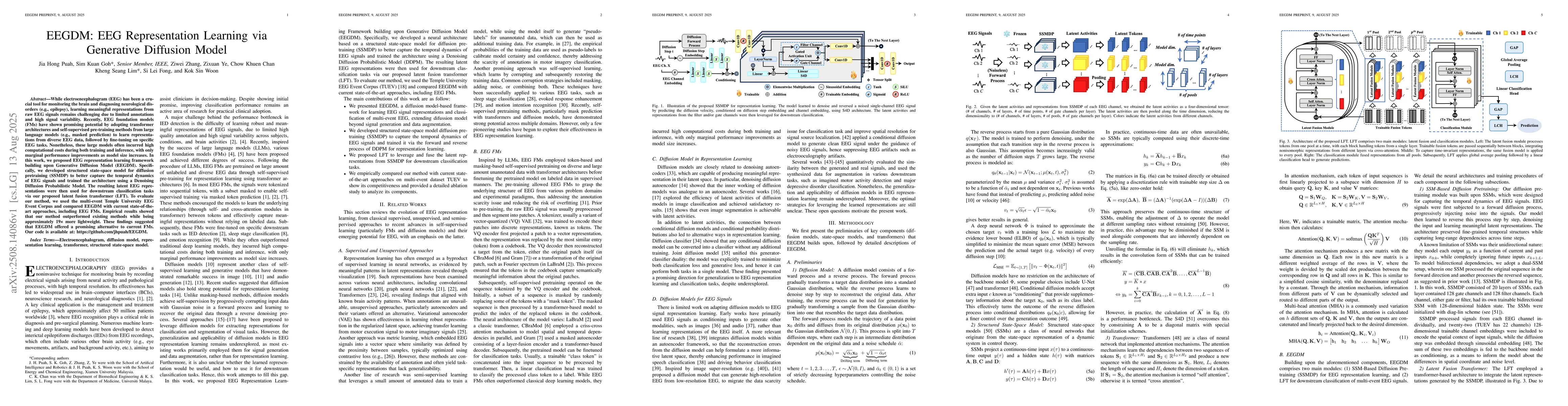While electroencephalogram (EEG) has been a crucial tool for monitoring the brain and diagnosing neurological disorders (e.g., epilepsy), learning meaningful representations from raw EEG signals remains challenging due to limited annotations and high signal variability. Recently, EEG foundation models (FMs) have shown promising potential by adopting transformer architectures and self-supervised pre-training methods from large language models (e.g., masked prediction) to learn representations from diverse EEG data, followed by fine-tuning on specific EEG tasks. Nonetheless, these large models often incurred high computational costs during both training and inference, with only marginal performance improvements as model size increases. In this work, we proposed EEG representation learning framework building upon Generative Diffusion Model (EEGDM). Specifically, we developed structured state-space model for diffusion pretraining (SSMDP) to better capture the temporal dynamics of EEG signals and trained the architecture using a Denoising Diffusion Probabilistic Model. The resulting latent EEG representations were then used for downstream classification tasks via our proposed latent fusion transformer (LFT). To evaluate our method, we used the multi-event Temple University EEG Event Corpus and compared EEGDM with current state-of-the-art approaches, including EEG FMs. Empirical results showed that our method outperformed existing methods while being approximately 19x more lightweight. These findings suggested that EEGDM offered a promising alternative to current FMs. Our code is available at: https://github.com/jhpuah/EEGDM.