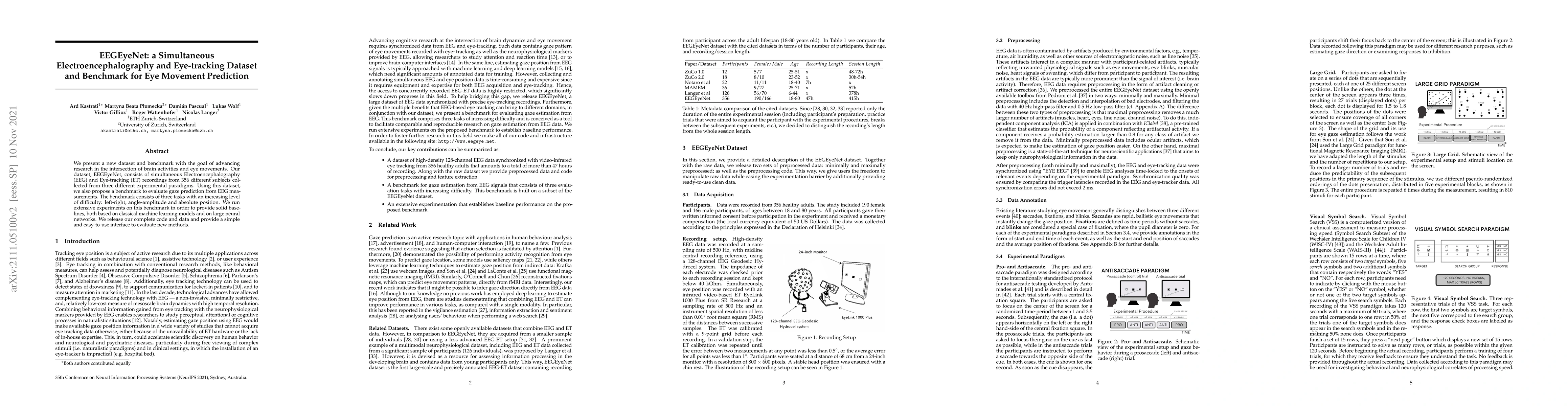 EEGEyeNet presents a new dataset combining EEG and eye-tracking data from 356 subjects to advance research on brain-eye movement interactions. The dataset includes a benchmark for gaze prediction tasks, offering baselines from machine learning and neural networks, and is released with complete code and data for easy evaluation.