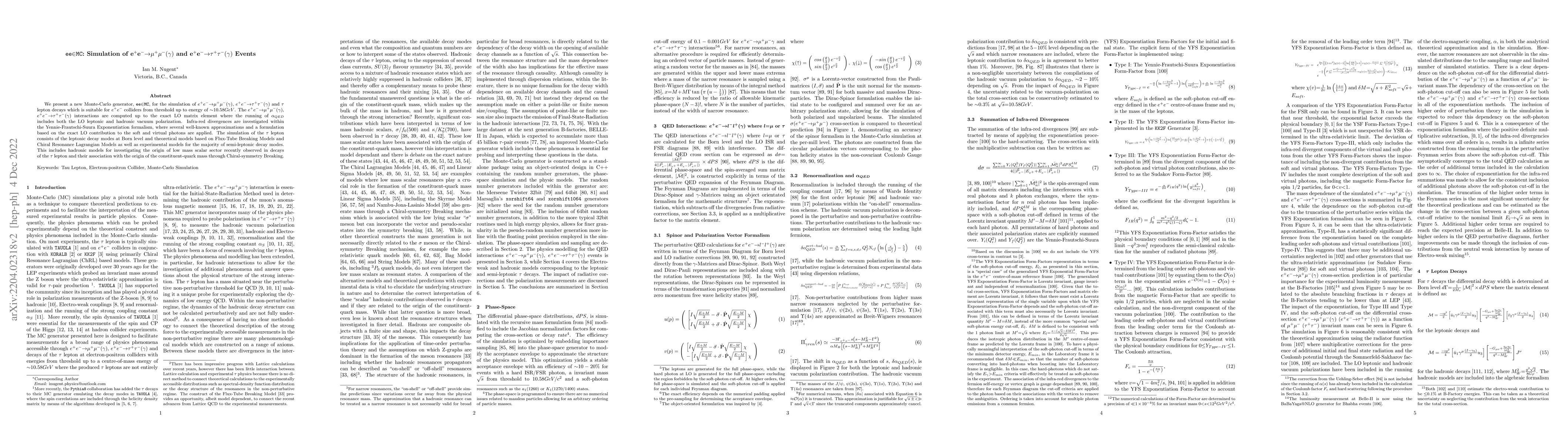 We present a new Monte-Carlo generator, {\tt ee$\in$MC}, for the simulation of $e^{+}e^{-} \to \mu^{+} \mu^{-} (\gamma) $, $e^{+}e^{-} \to \tau^{+}\tau^{-} (\gamma) $ and $\tau$ lepton decays which is suitable for $e^{+}e^{-}$ colliders from threshold up to energy of $\sim 10.58GeV$. The $e^{+}e^{-} \to \mu^{+} \mu^{-}(\gamma) $, $e^{+}e^{-} \to \tau^{+}\tau^{-}(\gamma)$ interactions are computed up to the exact LO matrix element where the running of $\alpha_{QED}$ includes both the LO leptonic and hadronic vacuum polarization. Infra-red divergences are investigated within the Yennie-Frautschi-Suura Exponentiation formalism, where several well-known approximations and a formulation based on the exact LO contribution to the soft and virtual photons are applied. The simulation of the $\tau$ lepton consists of the leptonic decay modes at Born level and theoretical models based on Flux-Tube Breaking Models and Chiral Resonance Lagrangian Models as well as experimental models for the majority of semi-leptonic decay modes. This includes hadronic models for investigating the origin of low mass scalar sector recently observed in decays of the $\tau$ lepton and their association with the origin of the constituent-quark mass through Chiral-symmetry Breaking.