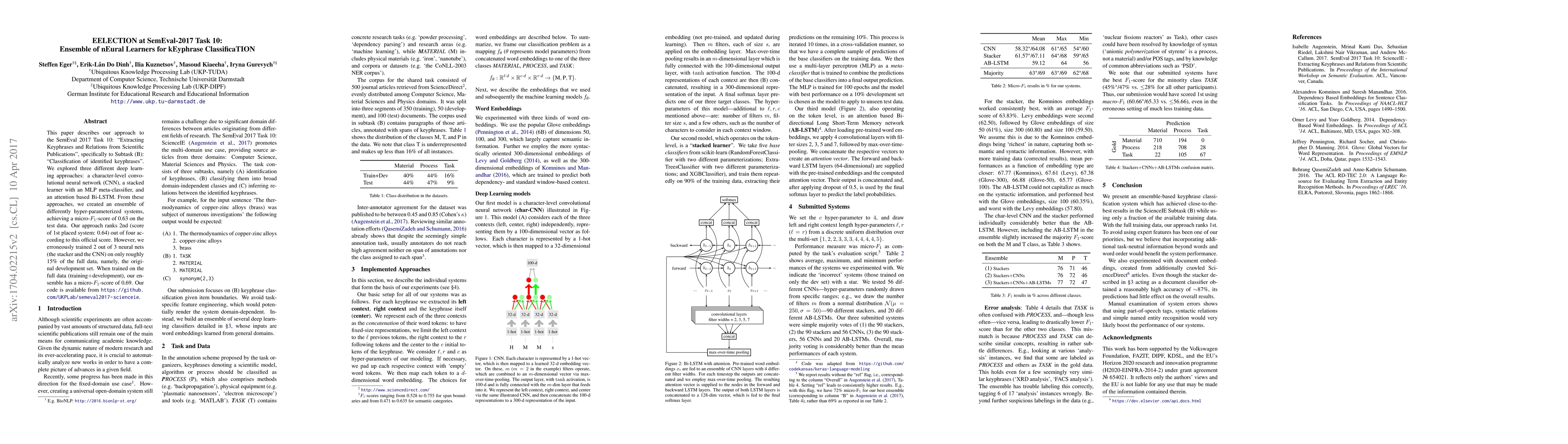 This paper describes our approach to the SemEval 2017 Task 10: "Extracting Keyphrases and Relations from Scientific Publications", specifically to Subtask (B): "Classification of identified keyphrases". We explored three different deep learning approaches: a character-level convolutional neural network (CNN), a stacked learner with an MLP meta-classifier, and an attention based Bi-LSTM. From these approaches, we created an ensemble of differently hyper-parameterized systems, achieving a micro-F1-score of 0.63 on the test data. Our approach ranks 2nd (score of 1st placed system: 0.64) out of four according to this official score. However, we erroneously trained 2 out of 3 neural nets (the stacker and the CNN) on only roughly 15% of the full data, namely, the original development set. When trained on the full data (training+development), our ensemble has a micro-F1-score of 0.69. Our code is available from https://github.com/UKPLab/semeval2017-scienceie.