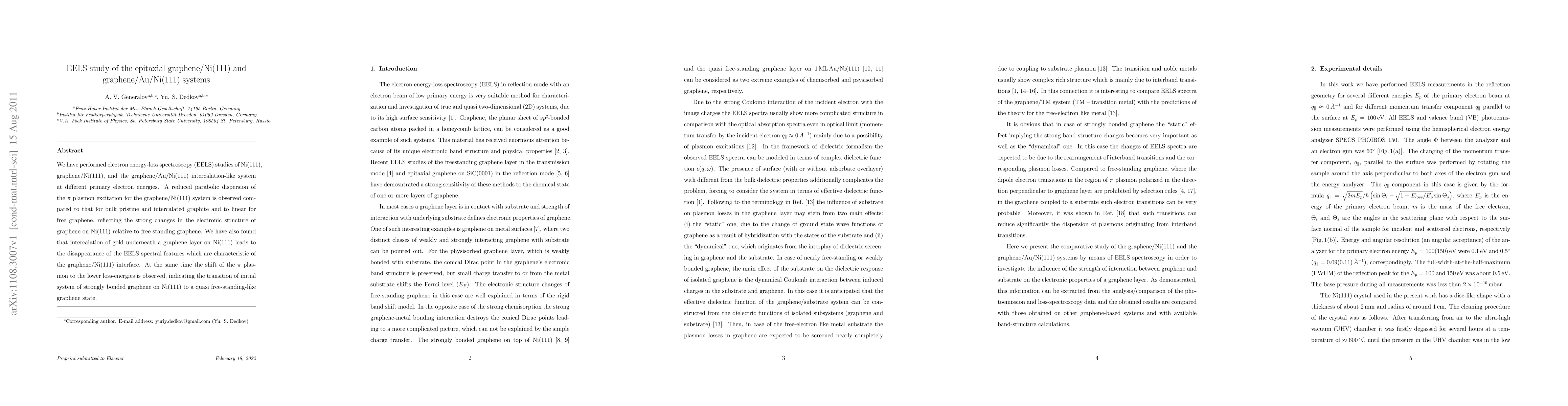 We have performed electron energy-loss spectroscopy (EELS) studies of Ni(111), graphene/Ni(111), and the graphene/Au/Ni(111) intercalation-like system at different primary electron energies. A reduced parabolic dispersion of the \pi plasmon excitation for the graphene/Ni(111) system is observed compared to that for bulk pristine and intercalated graphite and to linear for free graphene, reflecting the strong changes in the electronic structure of graphene on Ni(111) relative to free-standing graphene. We have also found that intercalation of gold underneath a graphene layer on Ni(111) leads to the disappearance of the EELS spectral features which are characteristic of the graphene/Ni(111) interface. At the same time the shift of the \pi plasmon to the lower loss-energies is observed, indicating the transition of initial system of strongly bonded graphene on Ni(111) to a quasi free-standing-like graphene state.