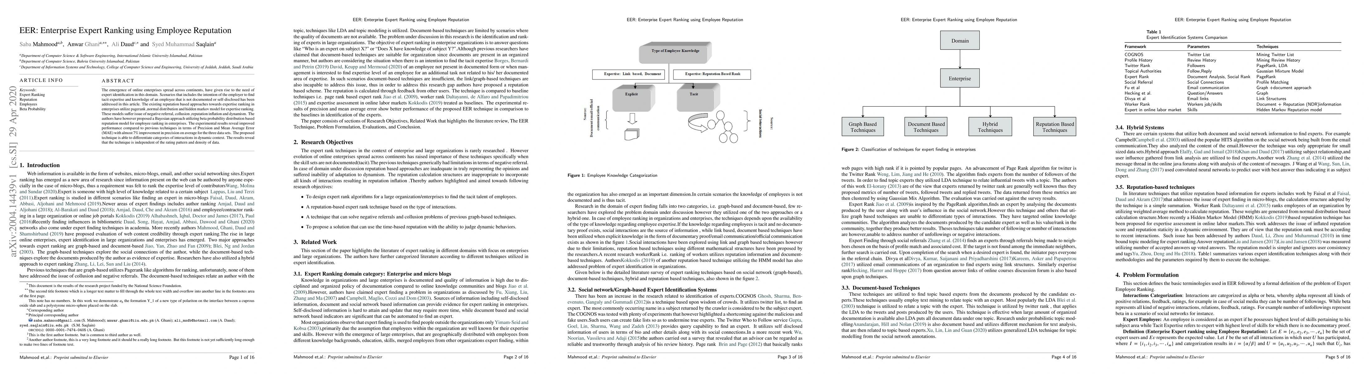The paper proposes a Bayesian reputation model using beta probability distribution for ranking enterprise experts, addressing issues like negative referral and collusion. Experimental results show a 7% improvement in precision over existing methods, demonstrating effective differentiation in dynamic contexts.