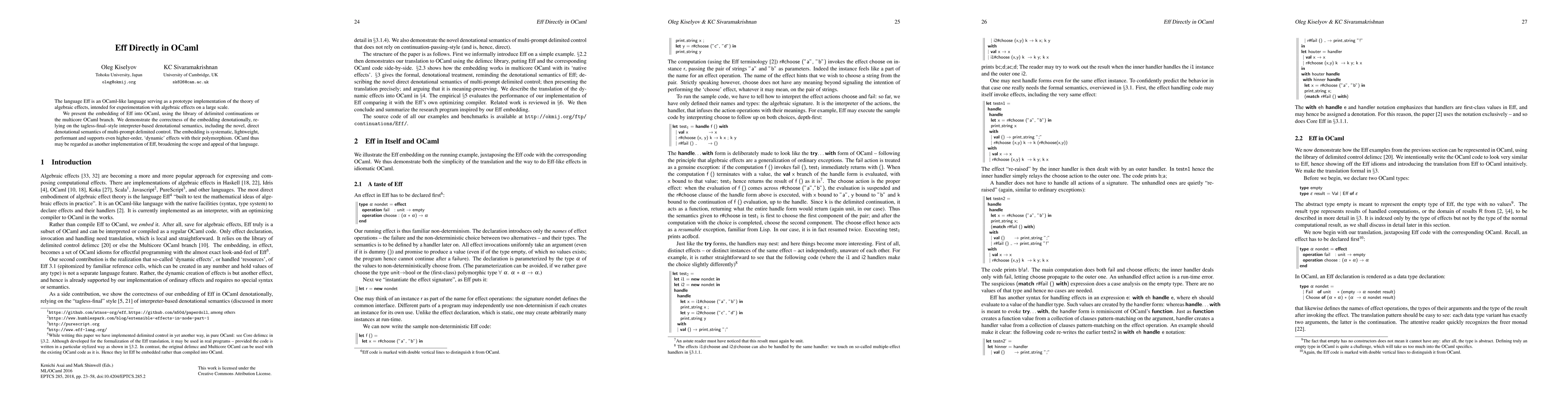 The Eff language, an OCaml-like prototype for algebraic effects, is embedded into OCaml using delimited continuations or multicore OCaml. This embedding is systematic, lightweight, and supports higher-order effects, demonstrating correctness through a tagless-final-style interpreter-based denotational semantics.