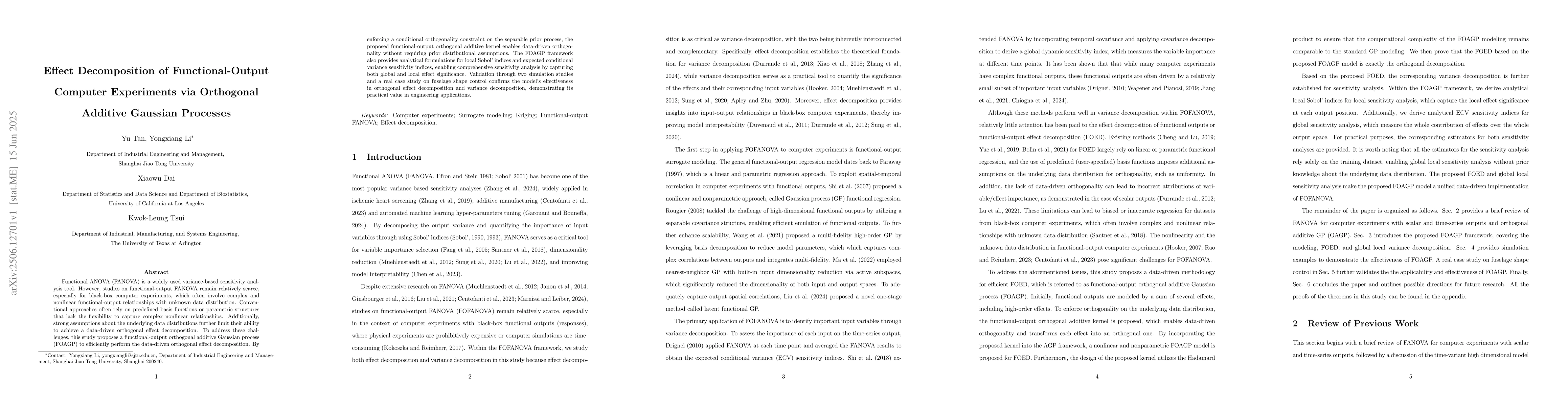 Functional ANOVA (FANOVA) is a widely used variance-based sensitivity analysis tool. However, studies on functional-output FANOVA remain relatively scarce, especially for black-box computer experiments, which often involve complex and nonlinear functional-output relationships with unknown data distribution. Conventional approaches often rely on predefined basis functions or parametric structures that lack the flexibility to capture complex nonlinear relationships. Additionally, strong assumptions about the underlying data distributions further limit their ability to achieve a data-driven orthogonal effect decomposition. To address these challenges, this study proposes a functional-output orthogonal additive Gaussian process (FOAGP) to efficiently perform the data-driven orthogonal effect decomposition. By enforcing a conditional orthogonality constraint on the separable prior process, the proposed functional-output orthogonal additive kernel enables data-driven orthogonality without requiring prior distributional assumptions. The FOAGP framework also provides analytical formulations for local Sobol' indices and expected conditional variance sensitivity indices, enabling comprehensive sensitivity analysis by capturing both global and local effect significance. Validation through two simulation studies and a real case study on fuselage shape control confirms the model's effectiveness in orthogonal effect decomposition and variance decomposition, demonstrating its practical value in engineering applications.