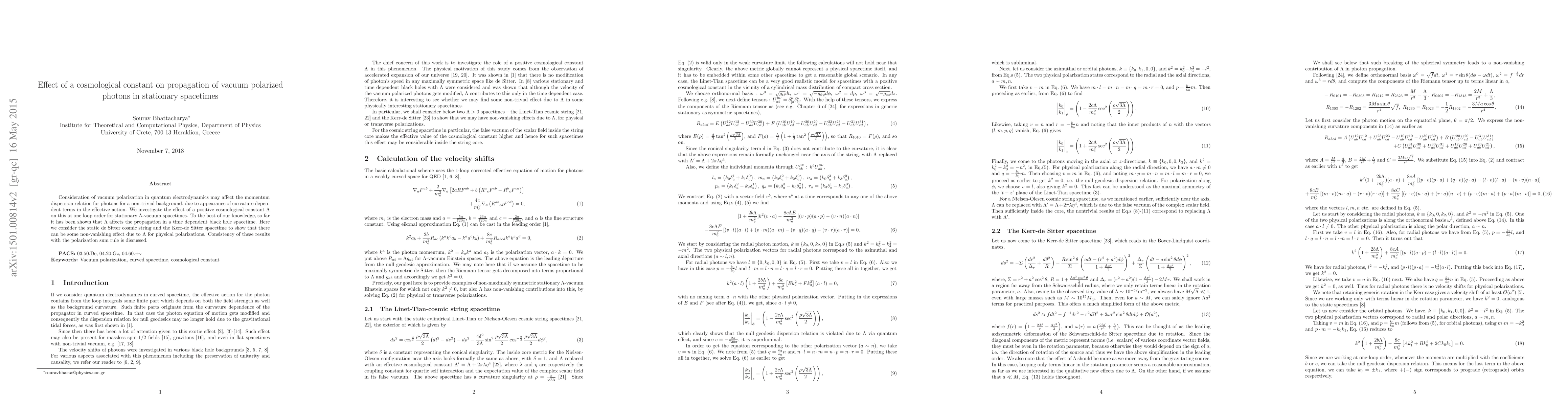 This paper examines how a positive cosmological constant $\Lambda$ influences the propagation of vacuum polarized photons in stationary spacetimes, specifically in static de Sitter cosmic string and Kerr-de Sitter spacetimes, revealing non-trivial effects due to $\Lambda$ on photon momentum dispersion. The findings are consistent with the polarization sum rule.