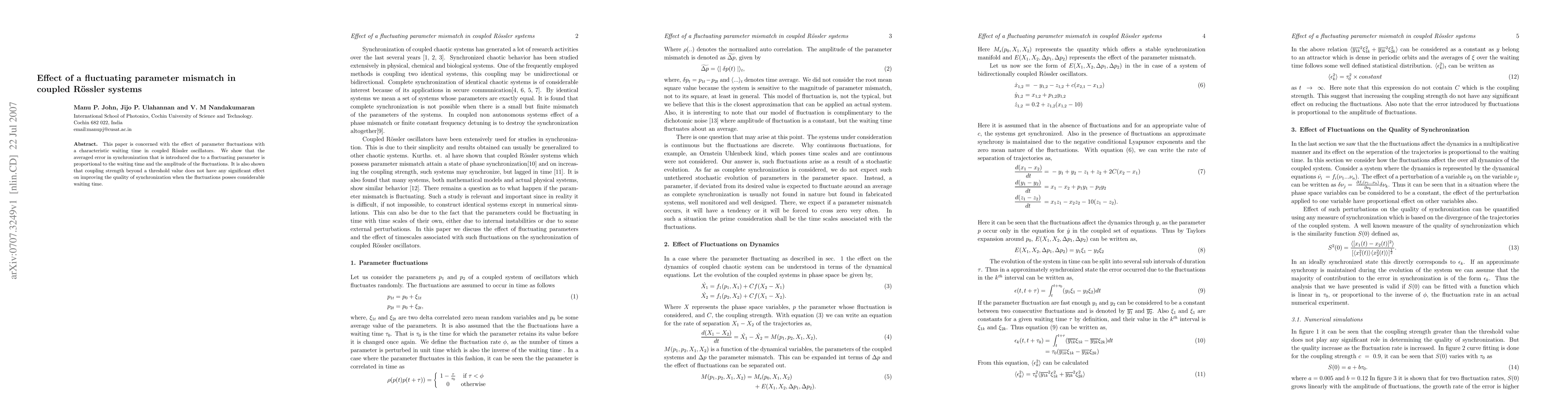 This paper investigates how parameter fluctuations in coupled Rössler oscillators affect synchronization, finding that the synchronization error is proportional to the fluctuation waiting time and amplitude. It concludes that beyond a threshold, increased coupling strength does not significantly improve synchronization quality with substantial fluctuation waiting times.