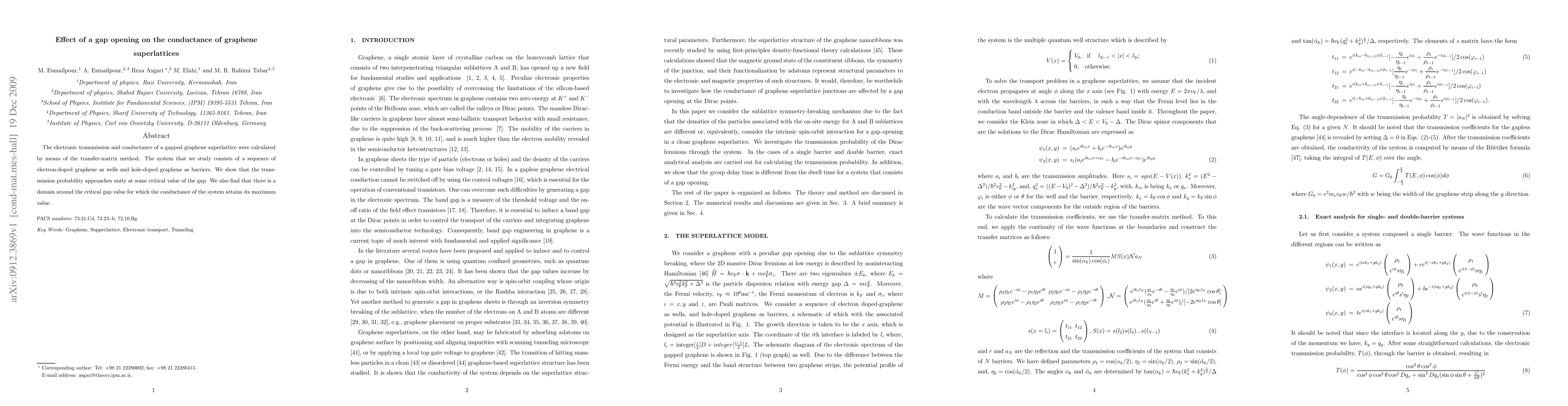 Researchers studied the electronic transmission and conductance of a graphene superlattice with a gap opening, finding that it approaches unity at a critical gap value and reaches its maximum conductance within a specific domain around this value.