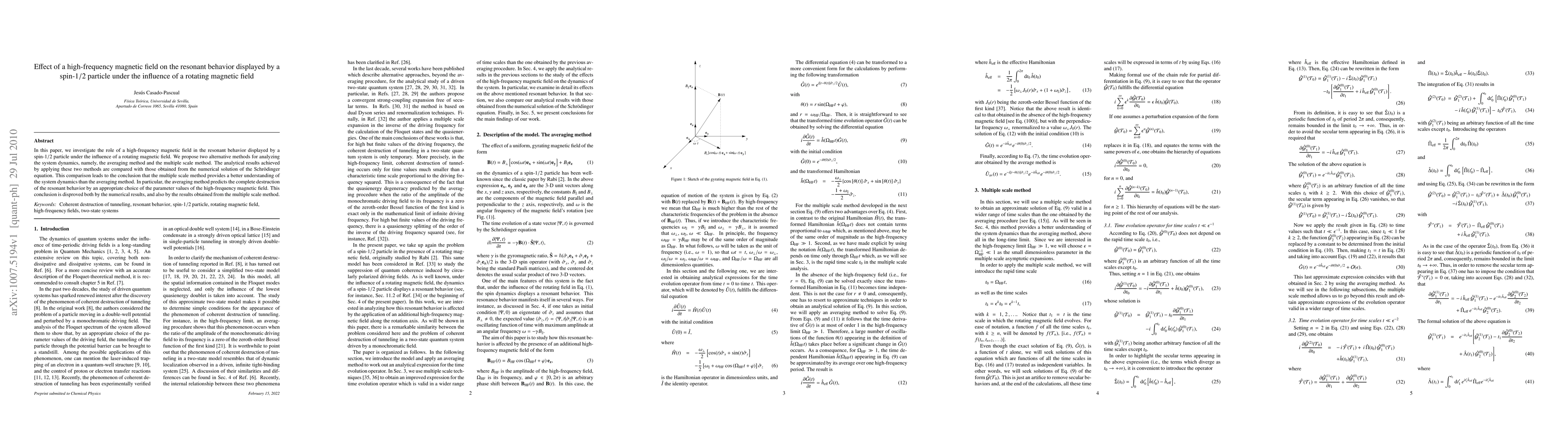 In this paper, we investigate the role of a high-frequency magnetic field in the resonant behavior displayed by a spin-$1/2$ particle under the influence of a rotating magnetic field. We propose two alternative methods for analyzing the system dynamics, namely, the averaging method and the multiple scale method. The analytical results achieved by applying these two methods are compared with those obtained from the numerical solution of the Schr\"odinger equation. This comparison leads to the conclusion that the multiple scale method provides a better understanding of the system dynamics than the averaging method. In particular, the averaging method predicts the complete destruction of the resonant behavior by an appropriate choice of the parameter values of the high-frequency magnetic field. This conclusion is disproved both by the numerical results, and also by the results obtained from the multiple scale method.
