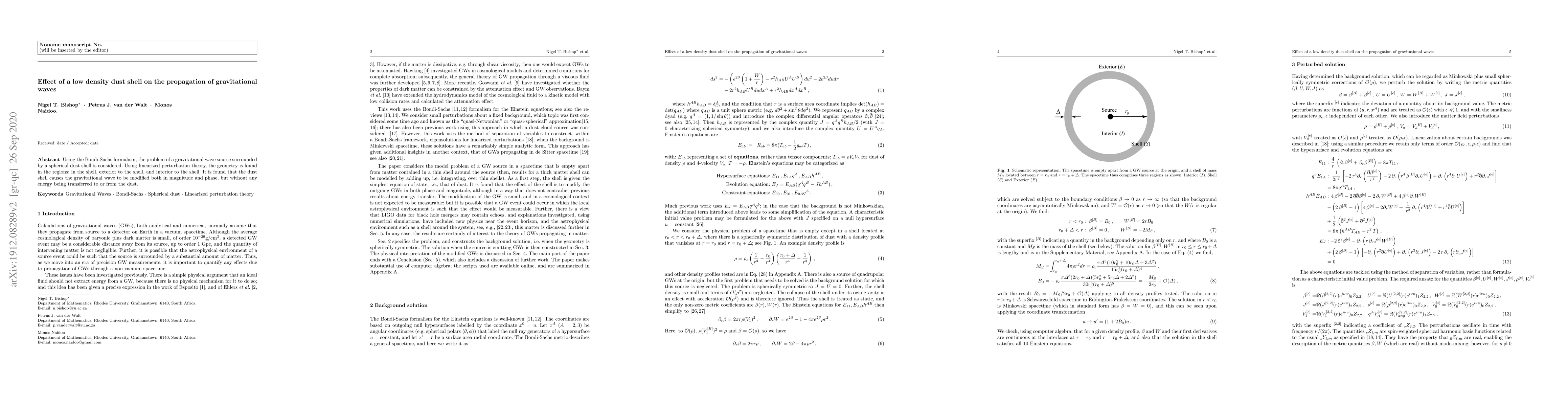 A dust shell surrounding a gravitational wave source modifies its magnitude and phase without transferring energy, according to a study using the Bondi-Sachs formalism and linearized perturbation theory.