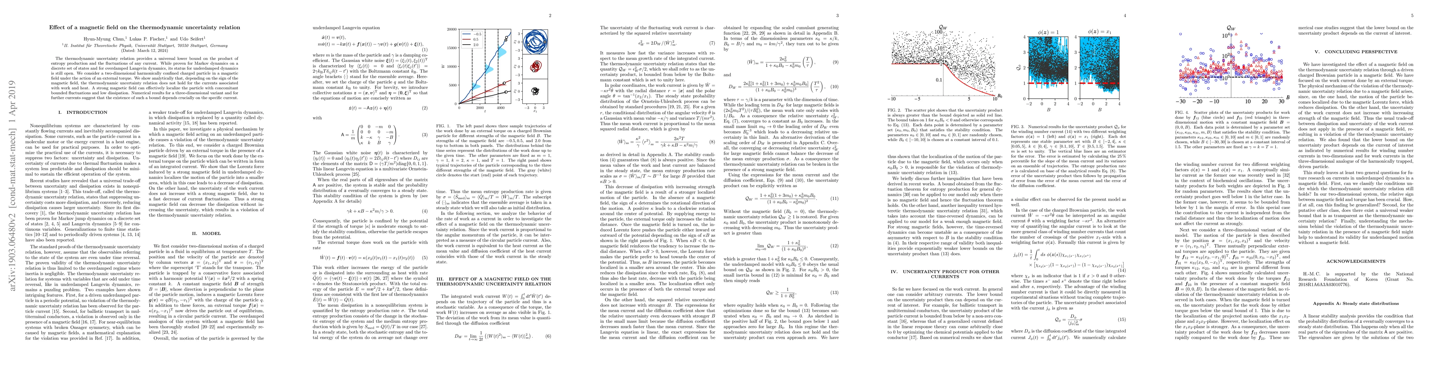This paper demonstrates that the thermodynamic uncertainty relation does not hold for underdamped dynamics of a charged particle in a magnetic field, depending on the field's sign. Strong magnetic fields can localize the particle, leading to bounded fluctuations and low dissipation.