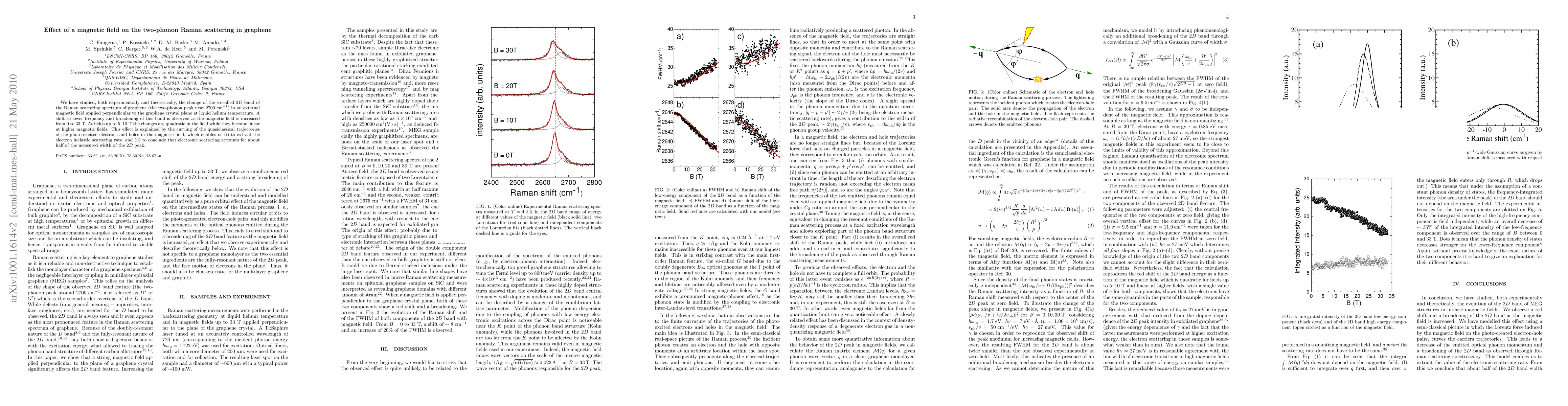 We have studied, both experimentally and theoretically, the change of the so-called 2D band of the Raman scattering spectrum of graphene (the two-phonon peak near 2700 cm-1) in an external magnetic field applied perpendicular to the graphene crystal plane at liquid helium temperature. A shift to lower frequency and broadening of this band is observed as the magnetic field is increased from 0 to 33 T. At fields up to 5--10 T the changes are quadratic in the field while they become linear at higher magnetic fields. This effect is explained by the curving of the quasiclassical trajectories of the photo-excited electrons and holes in the magnetic field, which enables us (i) to extract the electron inelastic scattering rate, and (ii) to conclude that electronic scattering accounts for about half of the measured width of the 2D peak.