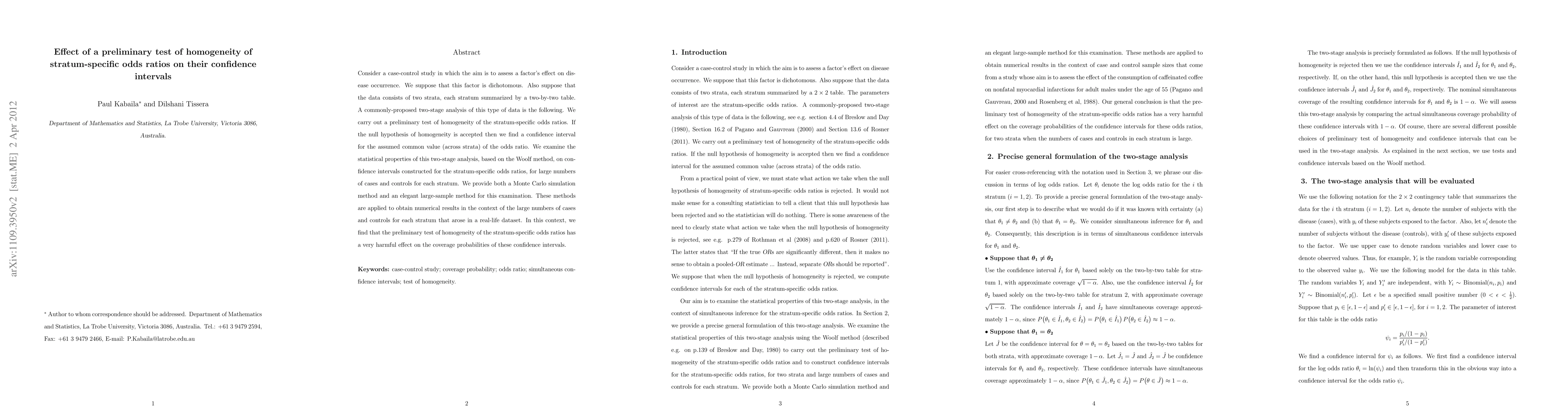 This paper examines the impact of a preliminary test for homogeneity of stratum-specific odds ratios on the confidence intervals in case-control studies with dichotomous factors. It finds that such a test significantly reduces the coverage probabilities of the confidence intervals, even with large sample sizes.