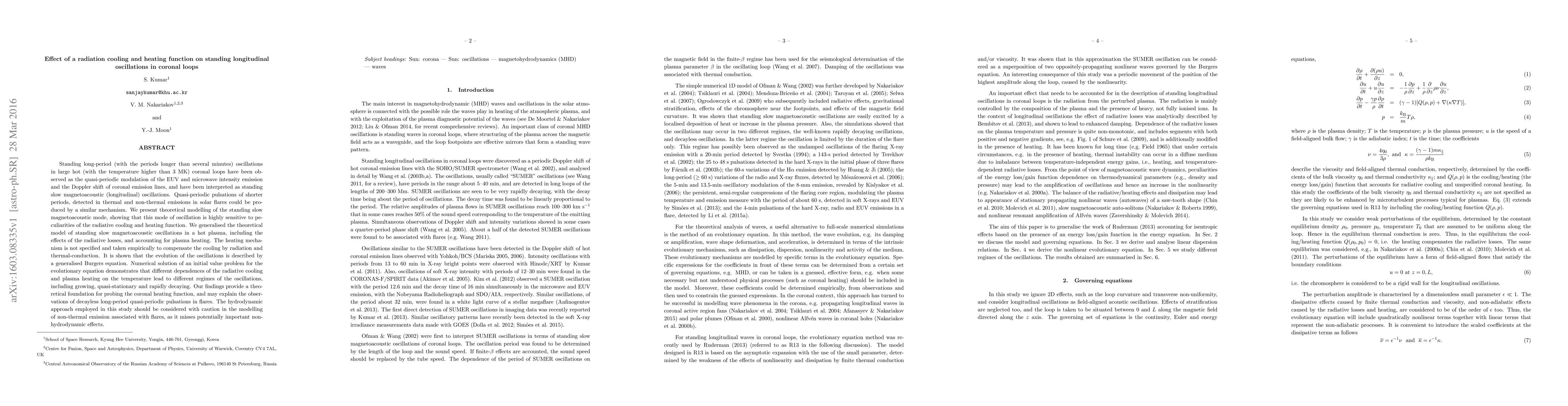 This paper presents a theoretical model of standing slow magnetoacoustic oscillations in coronal loops, showing that these oscillations are highly sensitive to radiative cooling and heating functions. The study finds that different temperature dependencies of these functions lead to various oscillation regimes, providing insights into the coronal heating mechanism and explaining long-period quasi-periodic pulsations in solar flares.