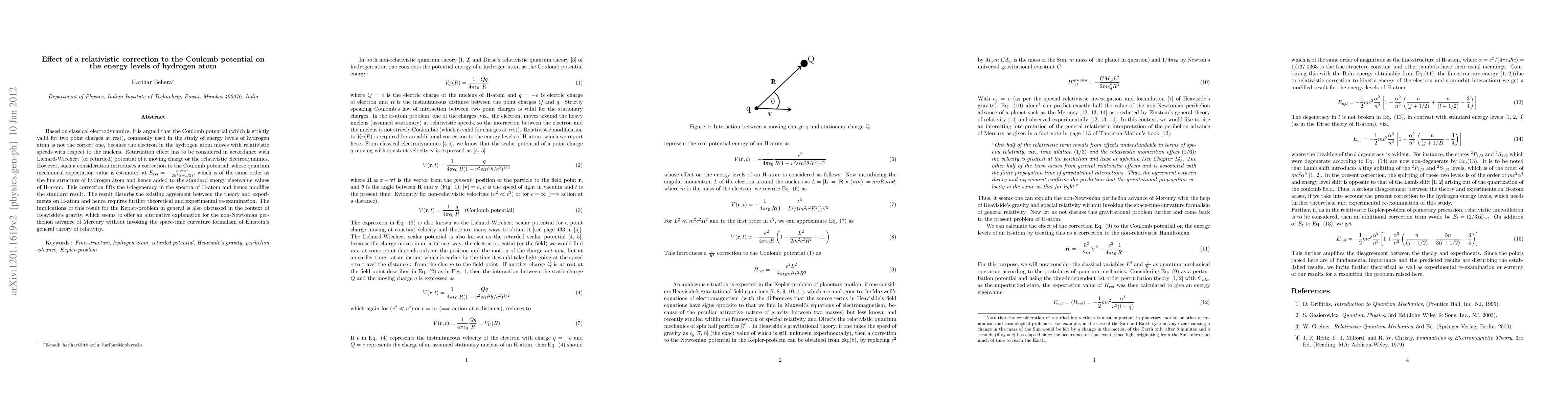 This paper proposes a relativistic correction to the Coulomb potential due to the electron's relativistic speed in the hydrogen atom, introducing a correction term that modifies the standard energy levels and lifts the $l$-degeneracy. This correction challenges existing theoretical-experimental agreements and suggests alternative explanations for phenomena like Mercury's perihelion advance.