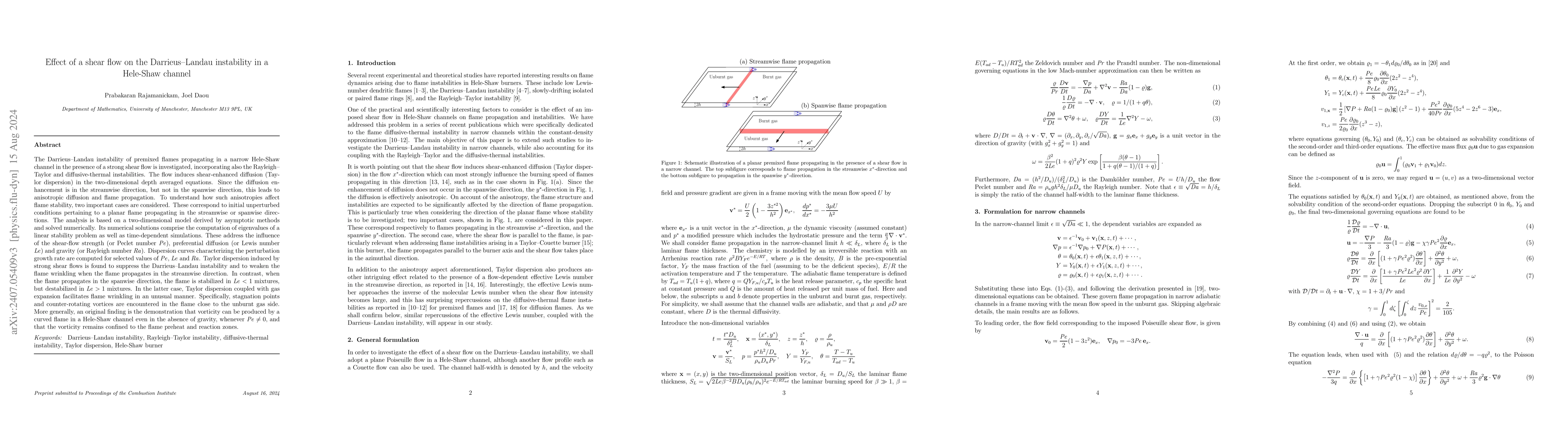 This study investigates the impact of shear flow on the Darrieus-Landau instability of flames in a Hele-Shaw channel, revealing that shear-induced anisotropic diffusion suppresses instability when flames propagate streamwise but can stabilize or destabilize flames depending on Lewis number when they propagate spanwise. Vorticity is shown to form even without gravity due to shear flow.