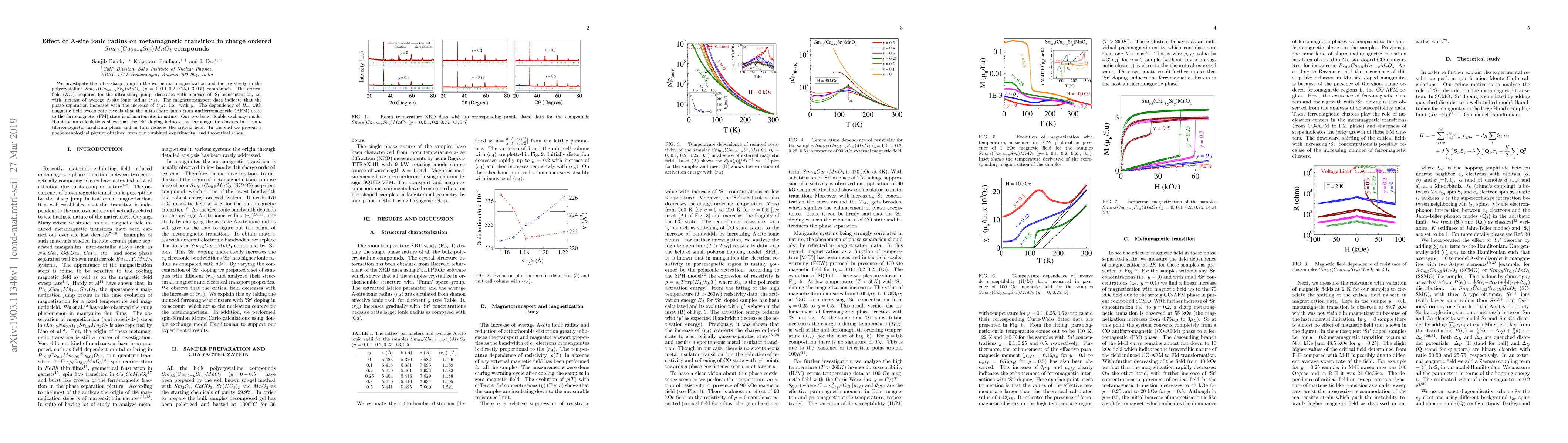 The research examines the impact of A-site ionic radius on metamagnetic transitions in $Sm_{0.5}(Ca_{0.5-y}Sr_{y})MnO_3$ compounds. Findings reveal that as Sr concentration (and thus A-site ionic radius) increases, the critical field for ultra-sharp magnetization and resistivity jumps decreases, indicating heightened phase separation and ferromagnetic clustering. The study utilizes magnetotransport data analysis and two-band double exchange model Hamiltonian calculations, suggesting that Sr doping fosters ferromagnetic clusters within the antiferromagnetic insulating phase, thereby lowering the critical field. The results present a phenomenological model combining experimental and theoretical insights.