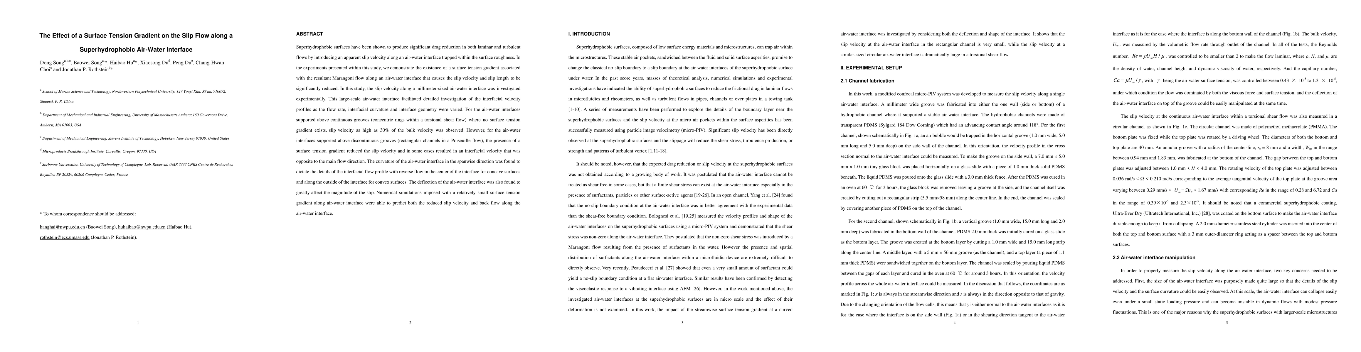 This study investigates how surface tension gradients affect slip flow along superhydrophobic air-water interfaces, demonstrating that such gradients can significantly reduce slip velocity and even cause reverse flow. Experimental results show that slip velocity is highest without surface tension gradients, while gradients lead to reduced slip and sometimes reverse flow, influenced by interface curvature and geometry.