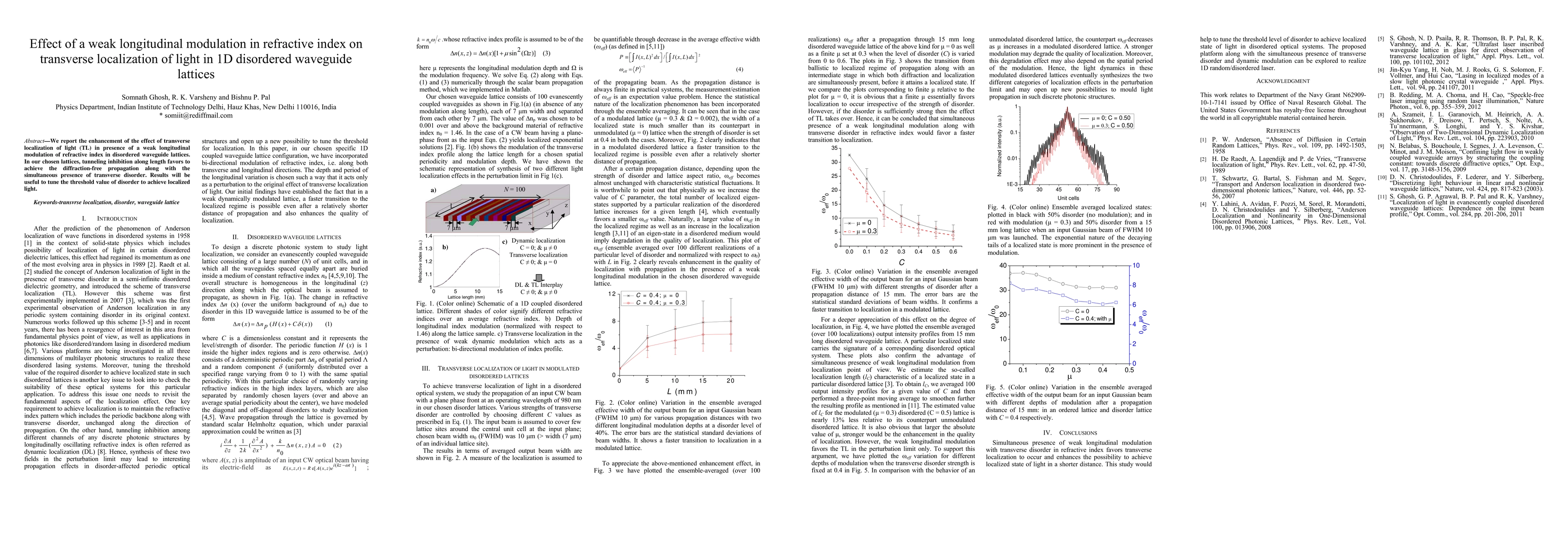 Summary: This study demonstrates that a weak longitudinal modulation in refractive index enhances transverse localization of light in 1D disordered waveguide lattices, achieving diffraction-free propagation despite transverse disorder, which can be tuned to optimize the threshold of disorder for localized light.