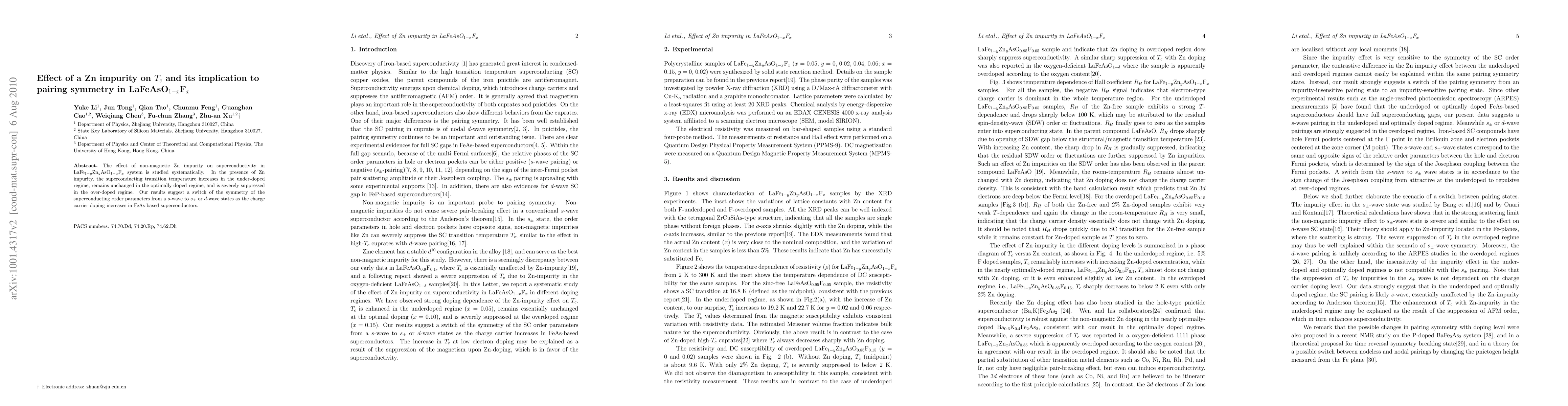 The effect of non-magnetic Zn impurity on superconductivity in LaFe$_{1-y}$Zn$_y$AsO$_{1-x}$F$_x$ system is studied systematically. In the presence of Zn impurity, the superconducting transition temperature increases in the under-doped regime, remains unchanged in the optimally doped regime, and is severely suppressed in the over-doped regime. Our results suggest a switch of the symmetry of the superconducting order parameters from a $s$-wave to $s_{\pm}$ or $d$-wave states as the charge carrier doping increases in FeAs-based superconductors.