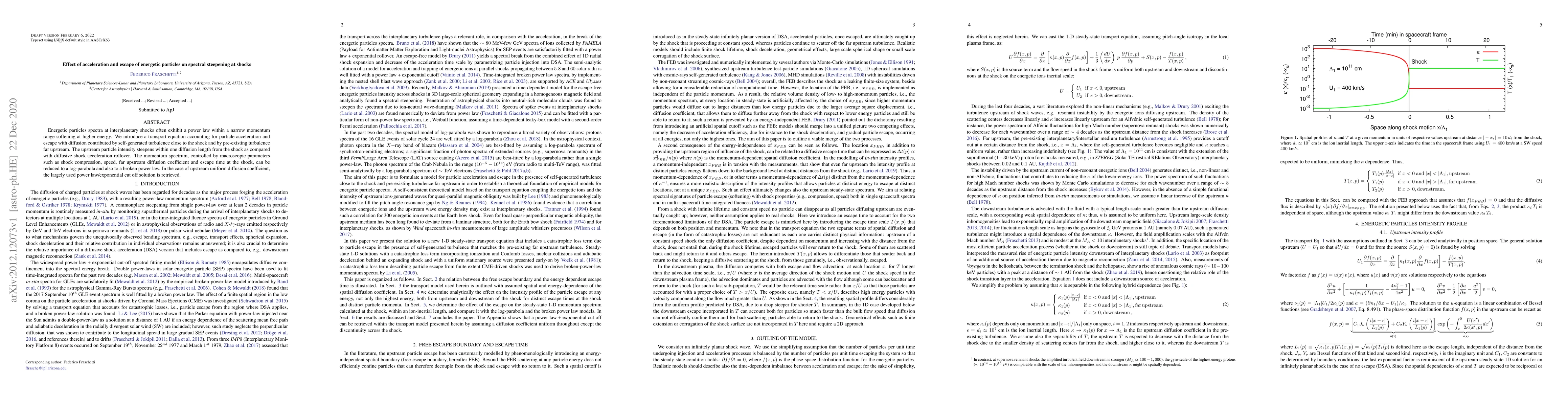 This paper develops a transport equation to model the acceleration and escape of energetic particles at shock fronts, showing that spectral steepening occurs due to self-generated turbulence near the shock and pre-existing turbulence upstream. The resulting momentum spectrum is described by a log-parabola or broken power law, differing from the traditional power law/exponential cutoff.