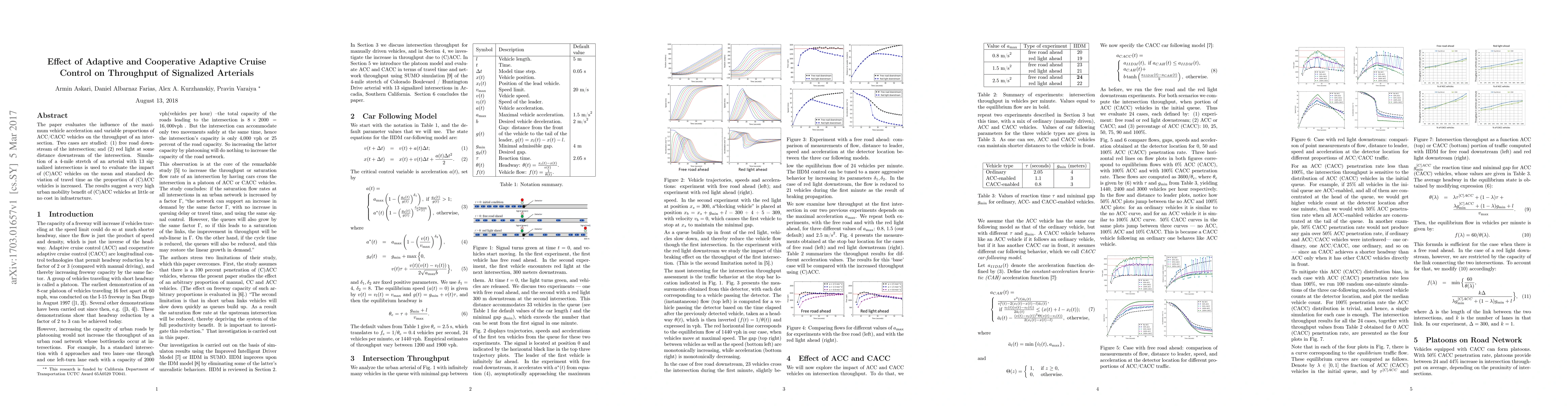 The paper evaluates the influence of the maximum vehicle acceleration and variable proportions of ACC/CACC vehicles on the throughput of an intersection. Two cases are studied: (1) free road downstream of the intersection; and (2) red light at some distance downstream of the intersection. Simulation of a 4-mile stretch of an arterial with 13 signalized intersections is used to evaluate the impact of (C)ACC vehicles on the mean and standard deviation of travel time as the proportion of (C)ACC vehicles is increased. The results suggest a very high urban mobility benefit of (C)ACC vehicles at little or no cost in infrastructure.