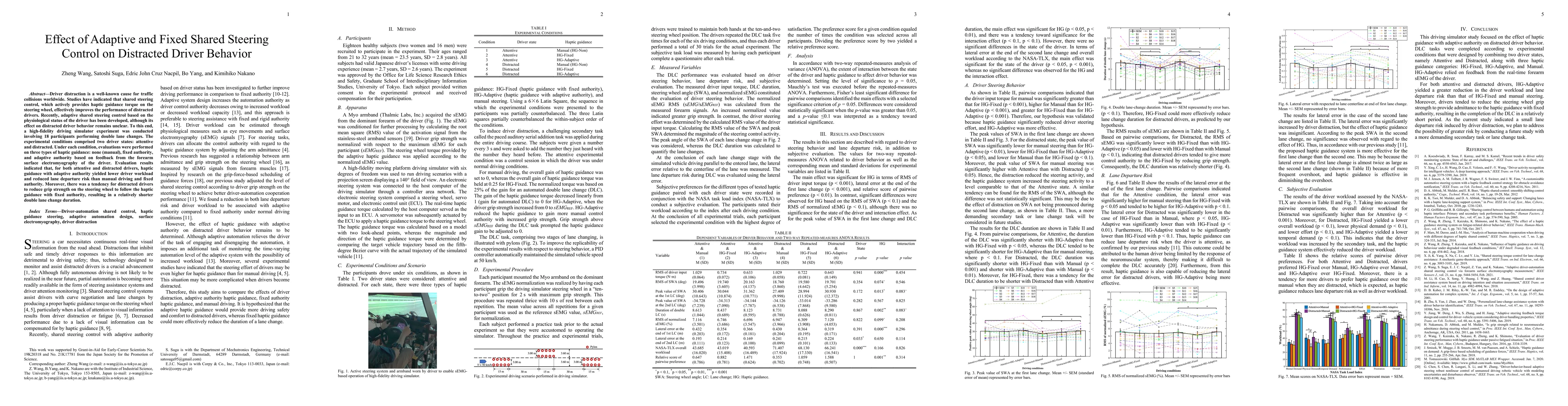 This study investigates how adaptive and fixed shared steering control affect distracted driver behavior using a high-fidelity driving simulator. Results show that adaptive shared steering control, based on driver physiological status, reduces workload and lane departure risk compared to manual and fixed control, especially for distracted drivers.